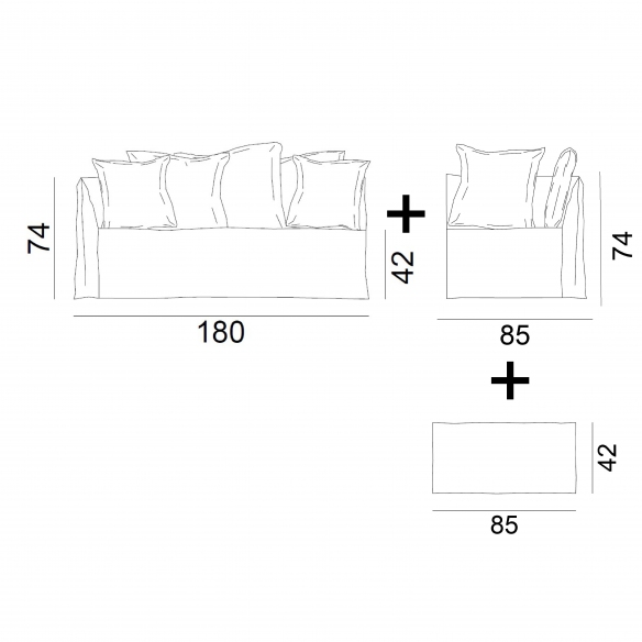 • Elemoento componibile Ghost 31 L con un bracciolo sinistro. Dimensioni: Lunghezza 180 cm, Profondita 85 cm, Altezza 74 cm, Altezza seduta 42