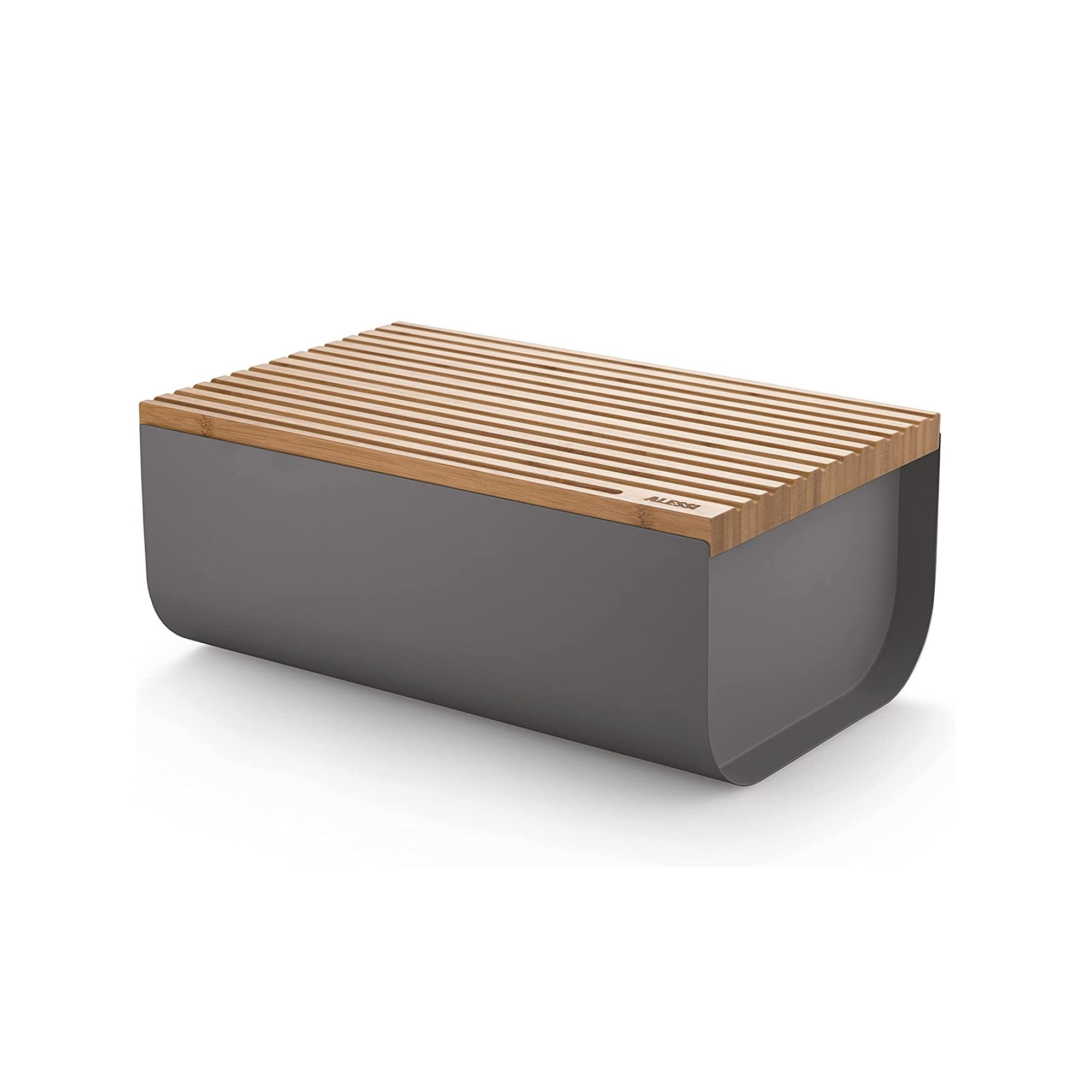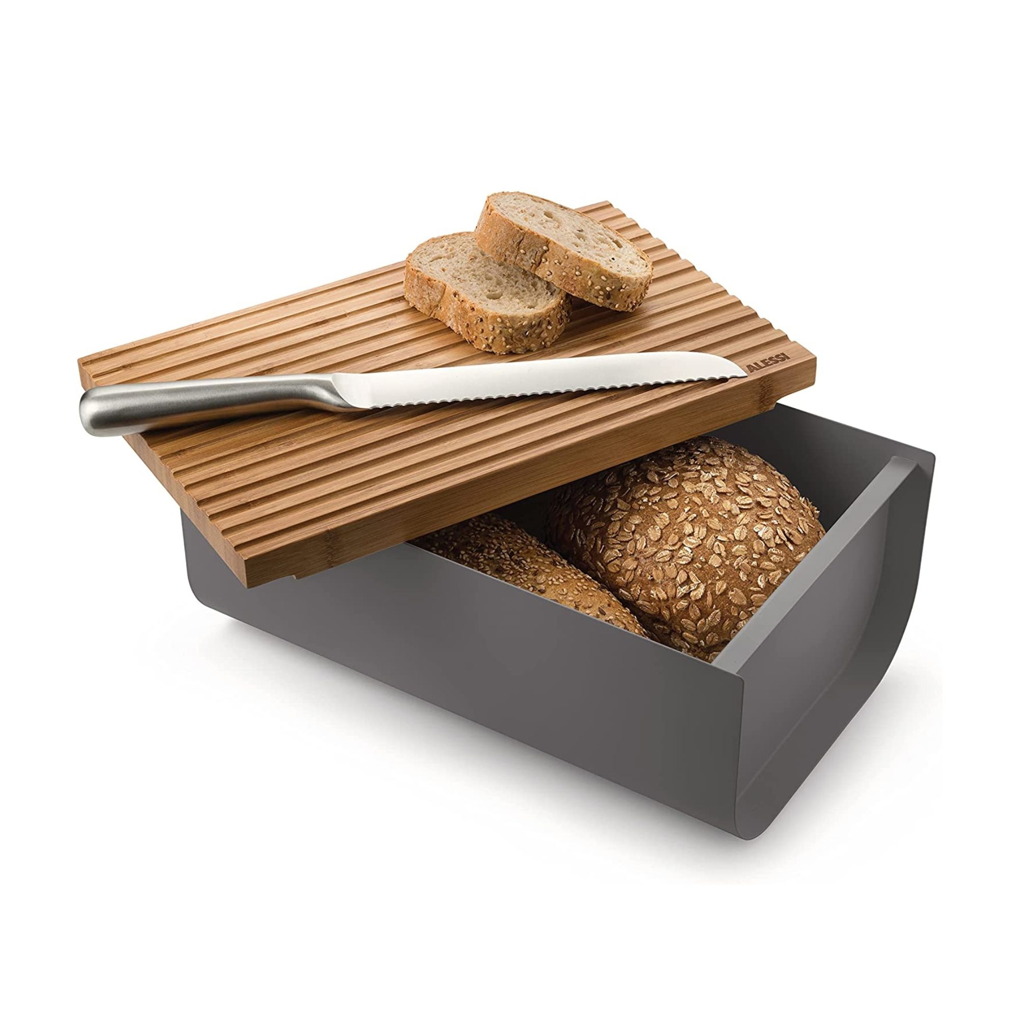 Mattina bread box made of steel coloured with epoxy resin with cutting board on bamboo wood. Very elegant and charming, it is not a simple breadbox but also a container whom lid is a practical chopping board designed for slicing bread in the best way possible. A multi-purpose object designed to accompany a daily gesture. Perfect for every occasion, Mattina is a mist-have in your kitchen! Designed by Big Game for Alessi.