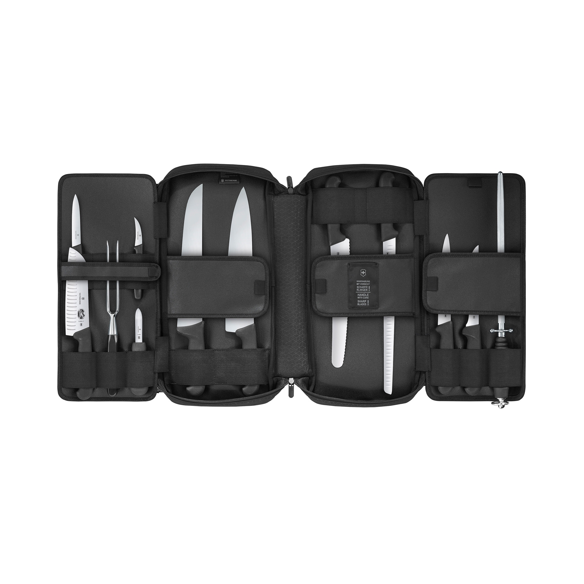 The Victorinox knife bag is an essential item for every chef. This bag, made of resistant and waterproof fabric, allows you to safely store and easily transport all your knives. The bag is designed to accommodate up to 15 knives or tools, which are secured inside through elastic bands and extra-strong Velcro. Even longer knives fit into this slim bag without any problems. Equipped with a handle and shoulder strap, the bag can be easily carried both by hand and on the shoulder. Furthermore, it features a zip closure on the side to ensure excellent safety during transport. Made by Victorinox.