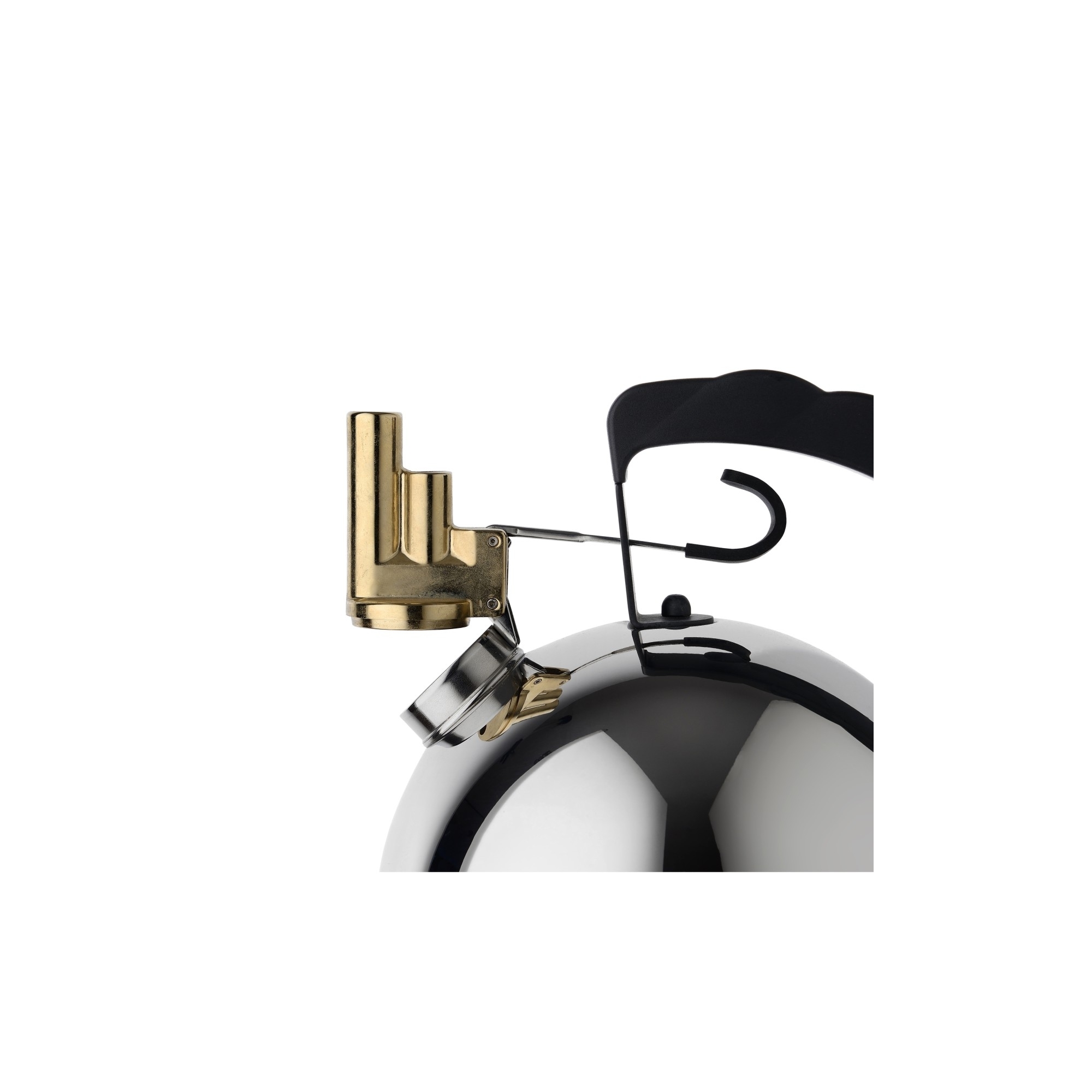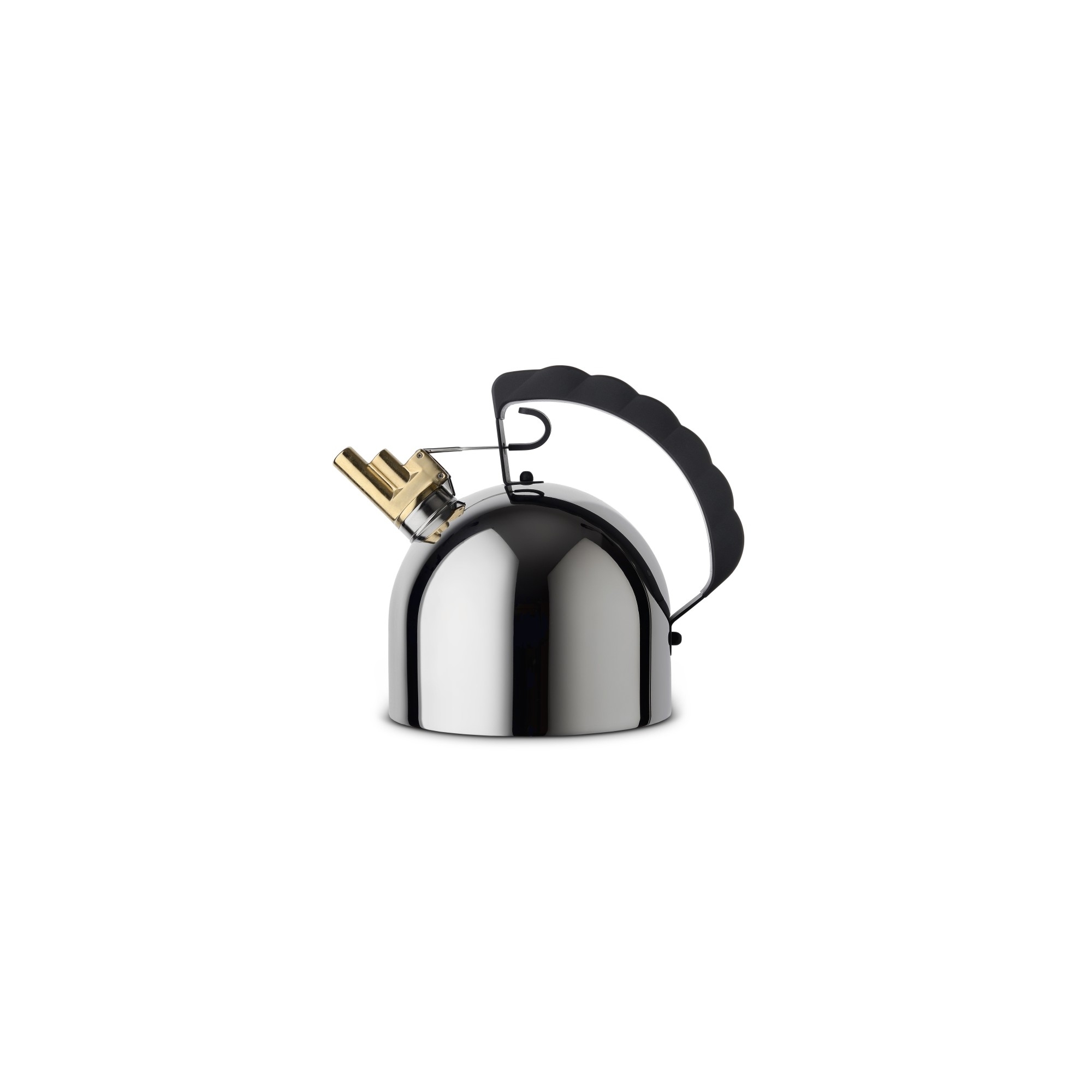 9091 kettle made of 18/10 stainless steel with melodic whistle in brass and black handle in PA. it is the iconic kettle of Alessi, the main characteristics is the whistle in brass in the pipes of which two choristers in mi and si have been inserted which, at the moment of the steam coming out, produce a small and nice melody. Very elegant and suggestive, this kettle is a must-have in your kitchen! Designed by Richard Sapper for Alessi.