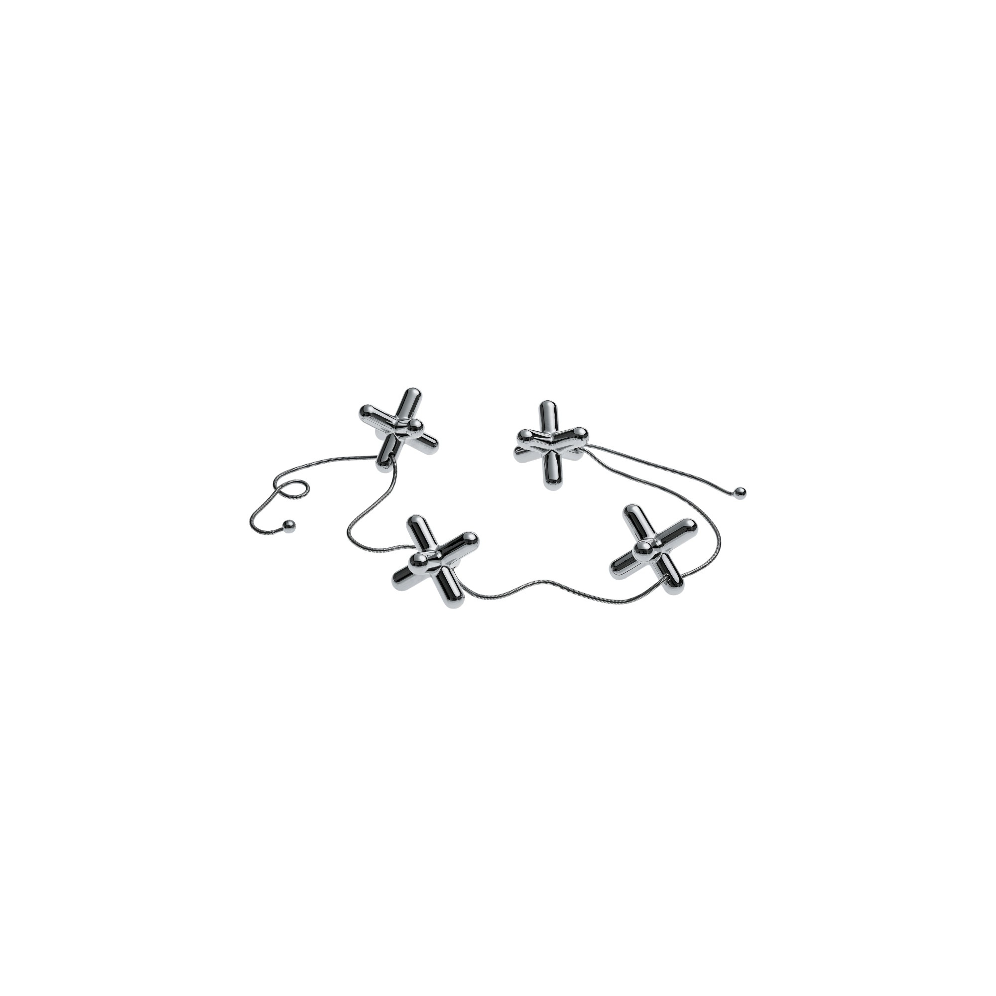 Tripod trivet with adjustable elements made of chrome-plated zamak. Looks like jewellery. It is designed to be hung on a hook in the kitchen and then grabbed and thrown on the table like dice. Once the little stars have been suitably arranged on the table, they form a base on which to support a pot, an oven dish, or a serving plate. Designed by Gabriele Chiave for Alessi.