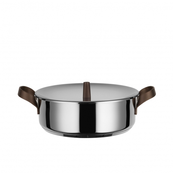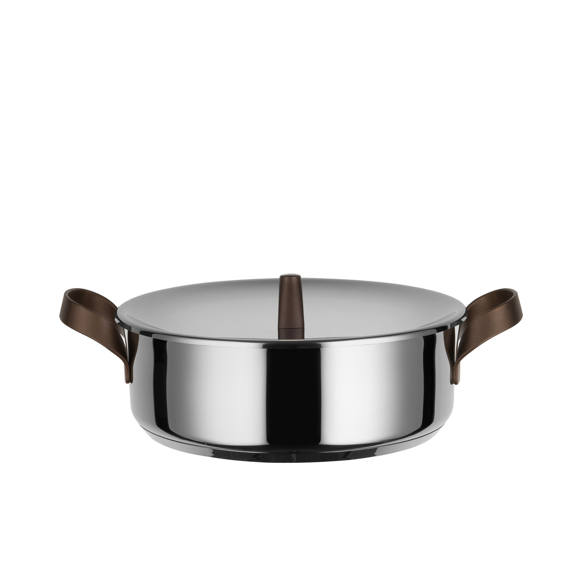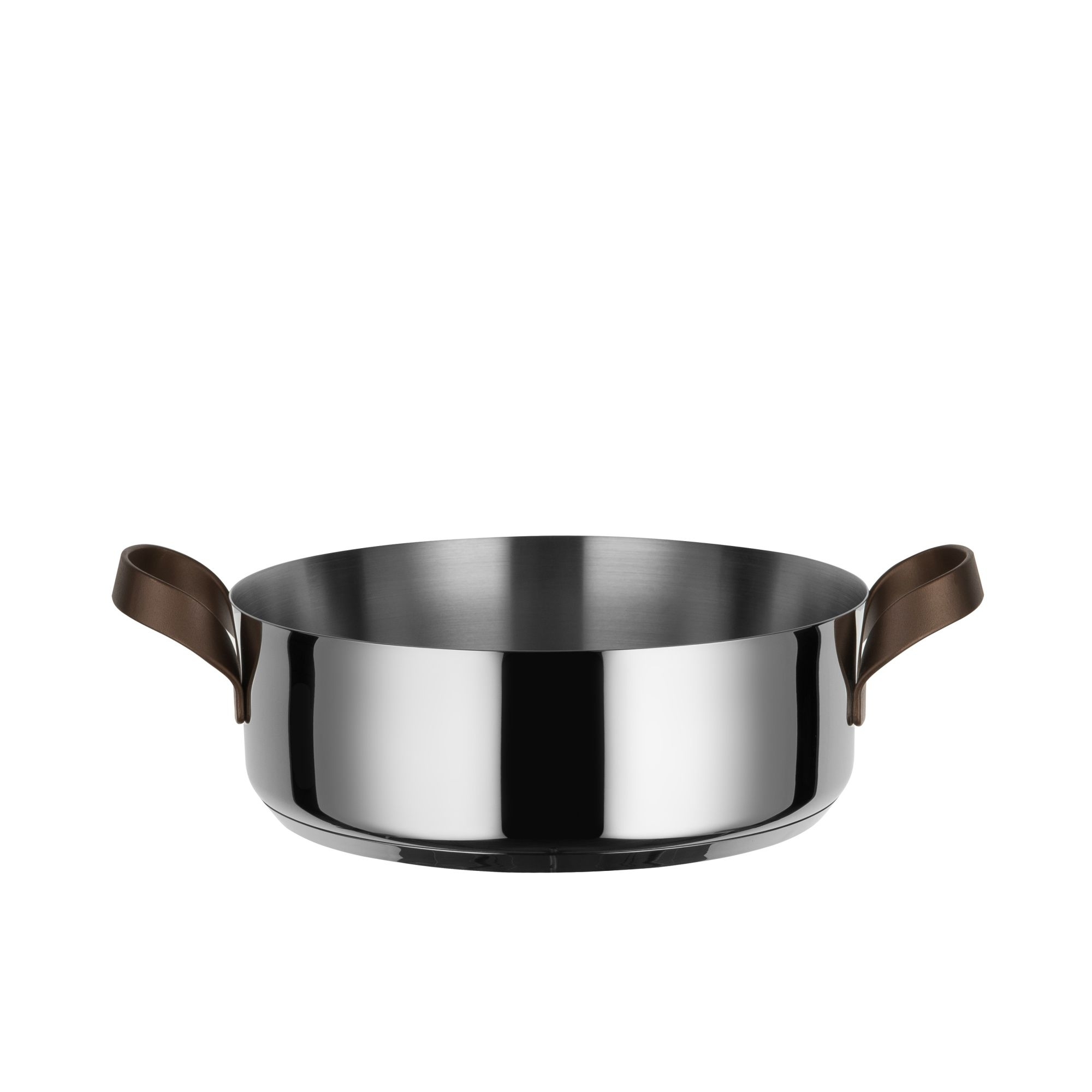 Edo low casserole with two handles with a diameter of 28 cm made of 18/10 stainless steel. Ideal for all types of preparation in the kitchen, from sauces to creams, from vegetable purees to risottos, the Edo long-handled casserole is perfect for both home and professional use. The magnetic steel bottom also makes it perfect for induction cooking, while the PVD-coated handle allows a safe and practical grip, avoiding burns. Designed by Patricia Urquiola for Alessi.