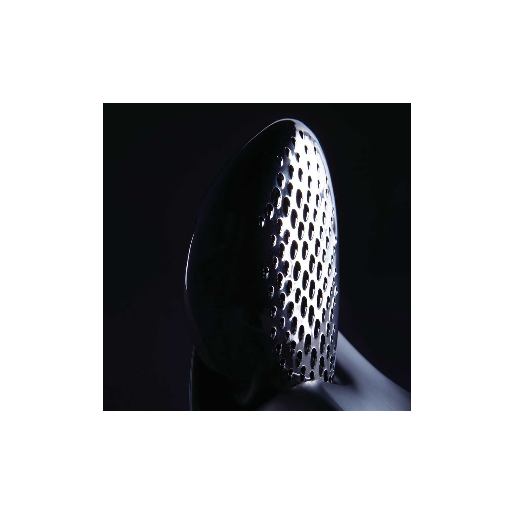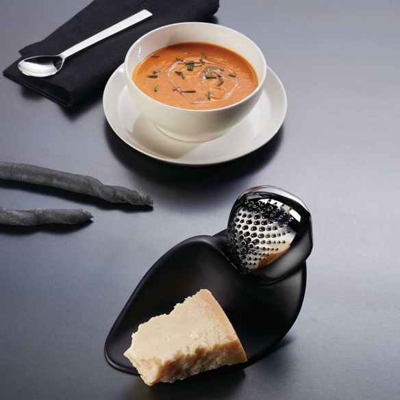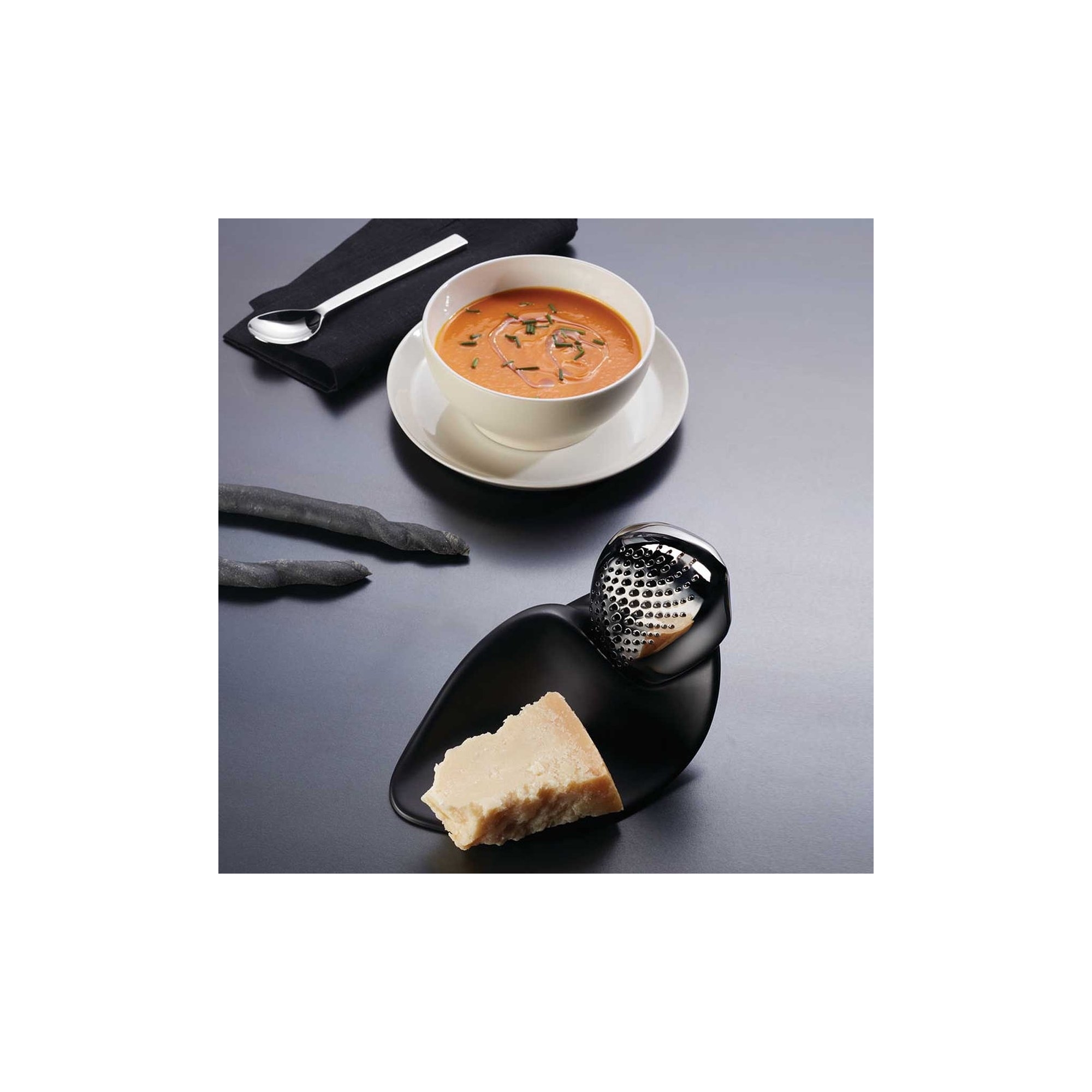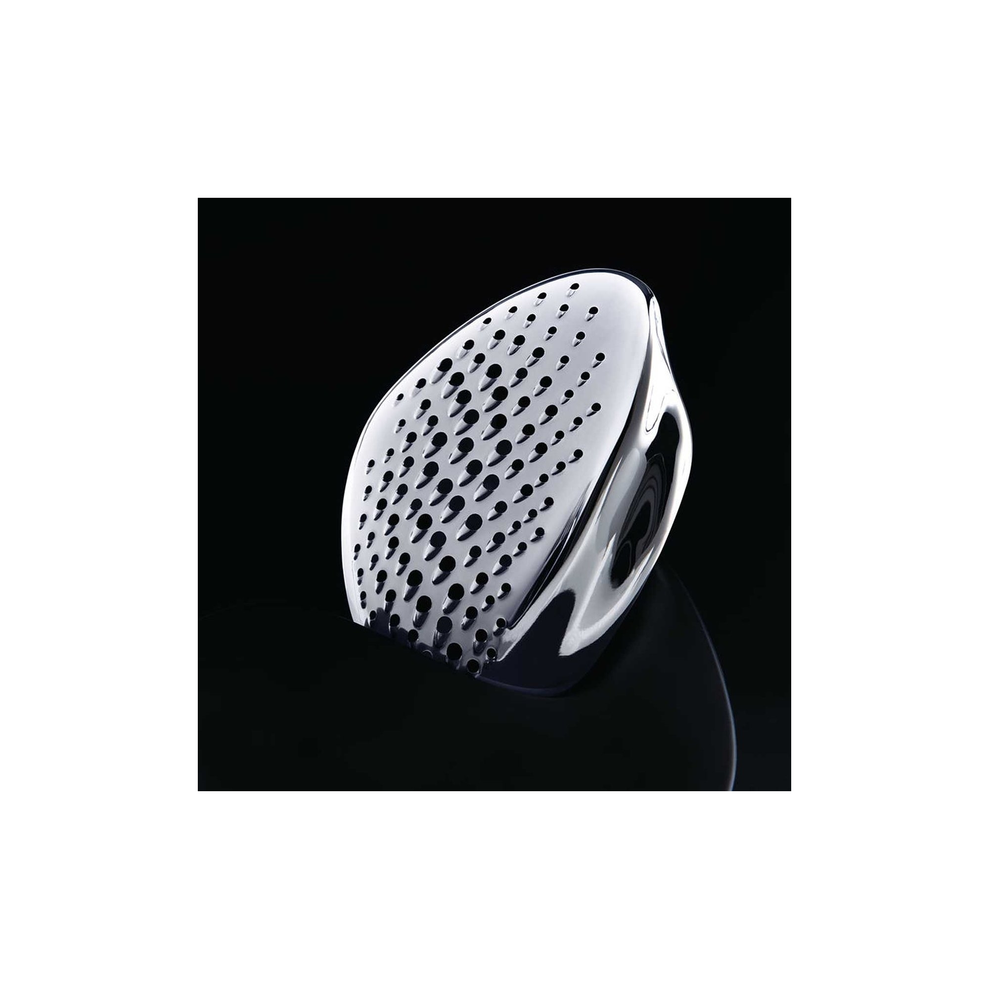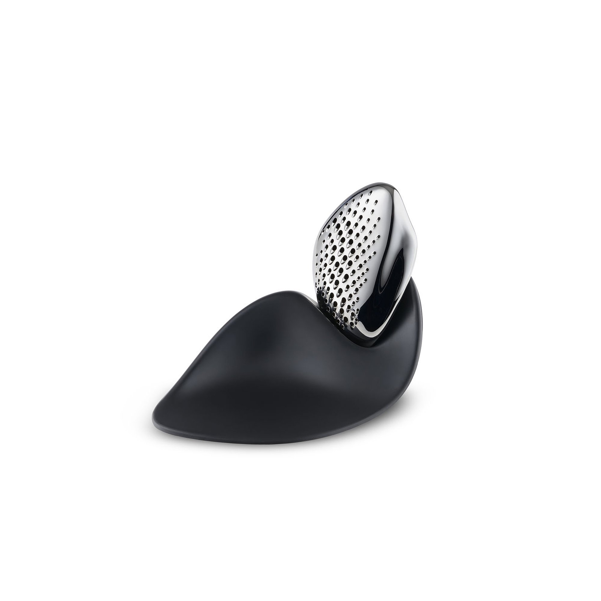 Forma grater made of 18/10 stainless steel with melamine base. Very elegant and characterized by a fresh and elegant design, inspired by pebbles smoothed by water and wind, Forma is a grater designed to adapt to the profile of the palm, easy and pleasant to hold. Provided with a slightly hollow part where to place the cheese flakes to be grated, the base allows the object to be transported directly to the table, ready for use for which it is intended. The stainless steel part is dishwasher safe, while it is advisable to clean the melamine part with a damp cloth. Designed by Zaha Hadid for Alessi.