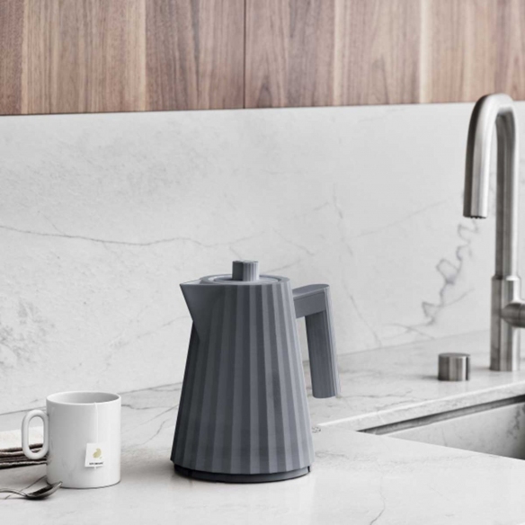 Plissé electric kettle 100 cl made of thermoplastic resin with English plug.  Plissé electric kettle has base with electric resistance and a robust body but light.  Moreover, it has button on base and antiscale filter. This kettle is an object recalls a fabric that a thick pleating transforms into a three-dimensional shape; this kettle is reminiscent of an haute couture dress. The plastic and fascinating design enrich the kitchen of every type of style and the different colour variants makes it suitable for every type of furniture. It is both a useful design and a piece of furniture. Designed by Michele De Lucchi for Alessi.