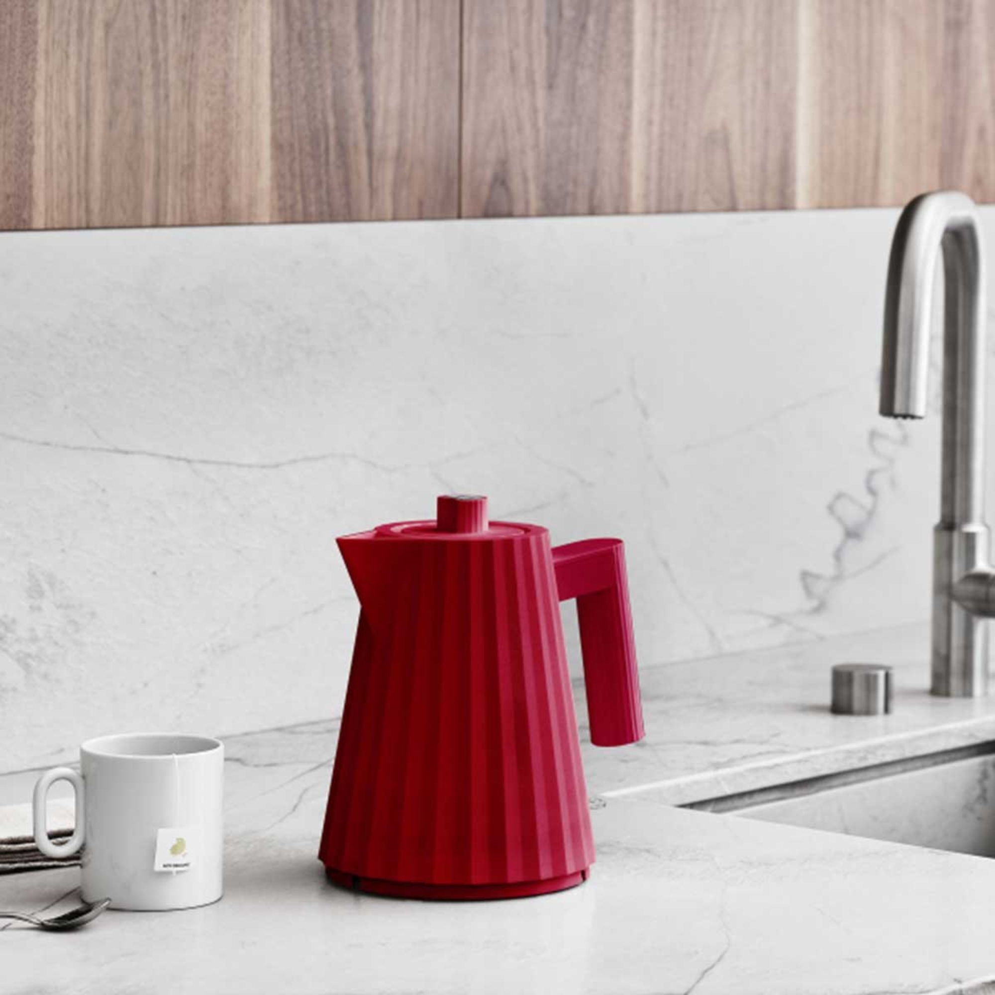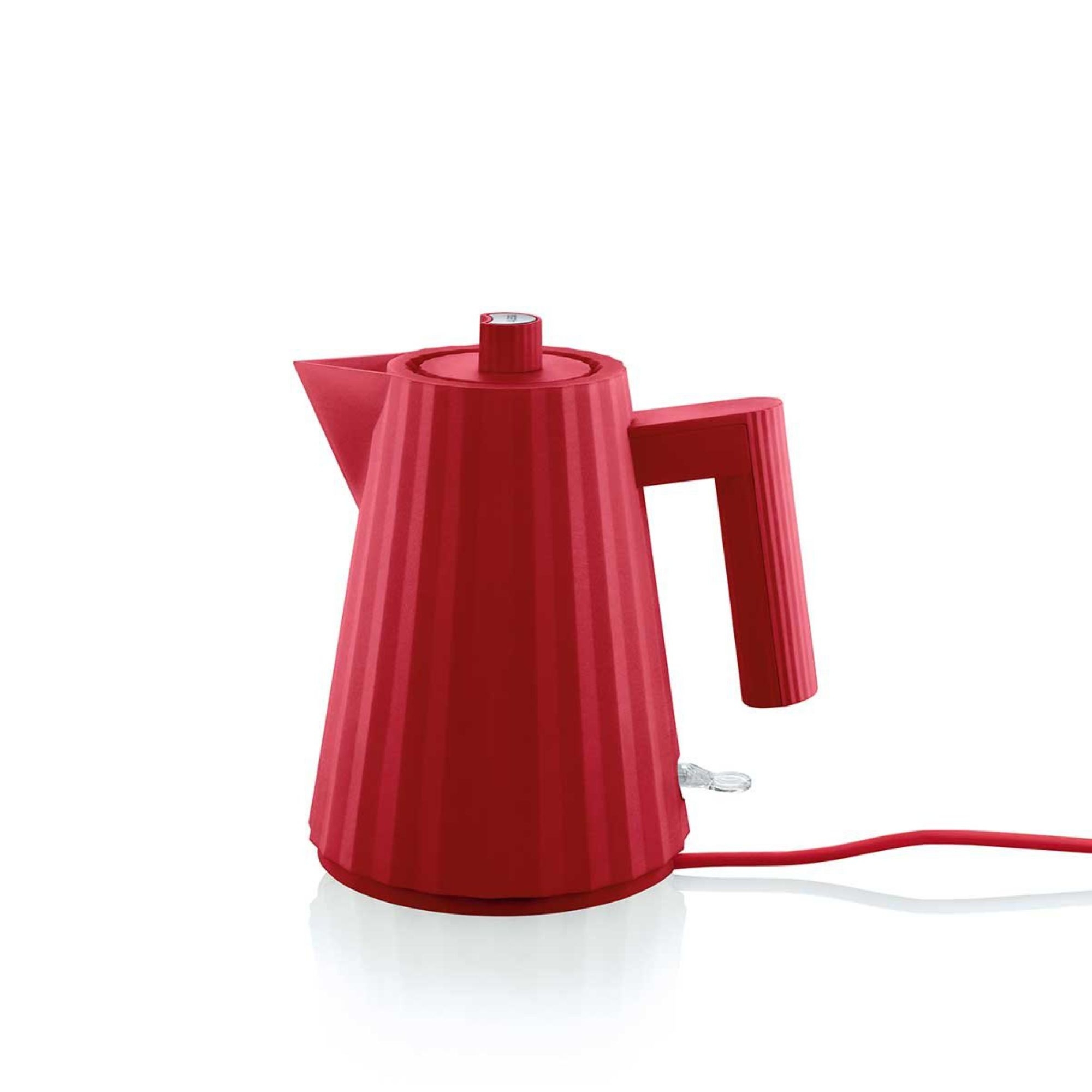 Plissé electric kettle 100 cl made of thermoplastic resin with English plug. Plissé electric kettle has base with electric resistance and a robust body but light. Moreover, it has button on base and antiscale filter. This kettle is an object recalls a fabric that a thick pleating transforms into a three-dimensional shape; this kettle is reminiscent of an haute couture dress. The plastic and fascinating design enrich the kitchen of every type of style and the different colour variants makes it suitable for every type of furniture. It is both a useful design and a piece of furniture. Designed by Michele De Lucchi for Alessi.