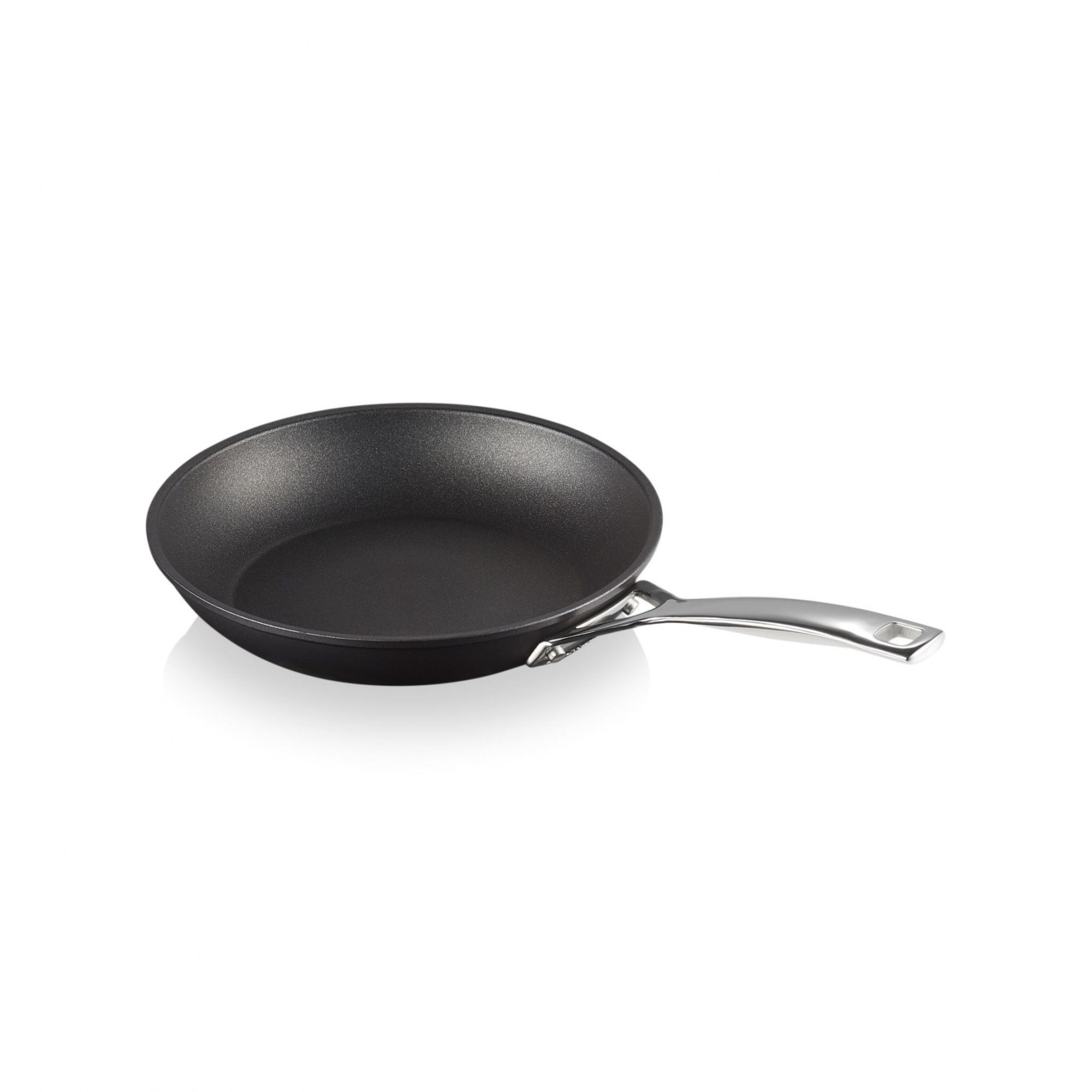 Low black non-stick aluminium pan with a diameter of 26 cm, made by Le Creuset