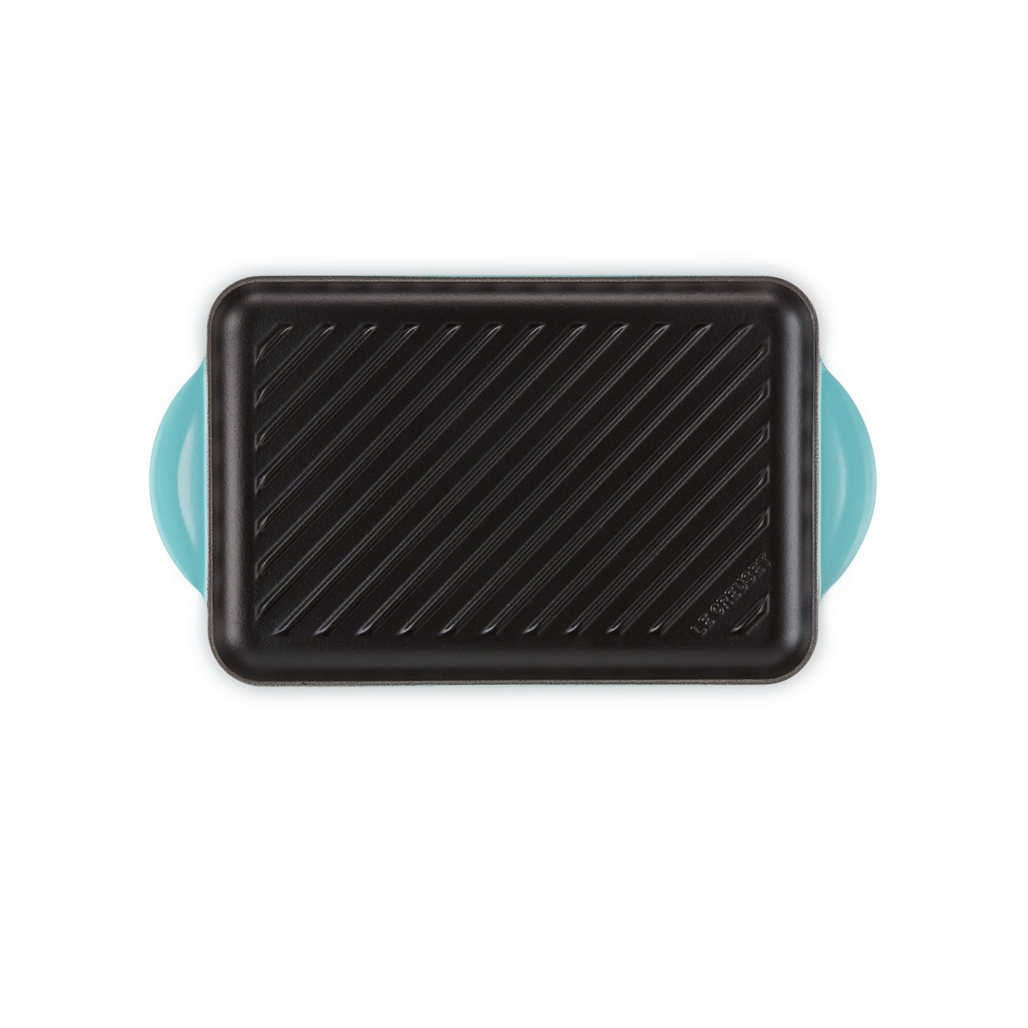 Enamelled cast iron grill available in 9 color finishings: Matt Black, Cherry, Orange, Marseille Blue, Deep Teal, Caribe Blue, Yellow, Mist Gray and Meringue, made by Le Creuset.
