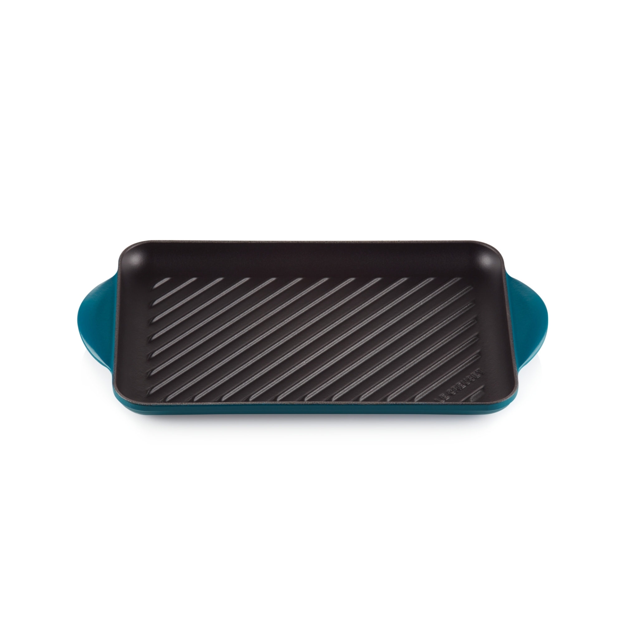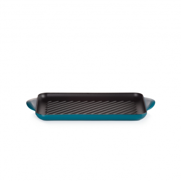 Enamelled cast iron grill available in 9 color finishings: Matt Black, Cherry, Orange, Marseille Blue, Deep Teal, Caribe Blue, Yellow, Mist Gray and Meringue, made by Le Creuset.