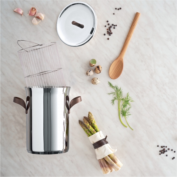 Edo asparagus pot with basket and lid in 18/10 stainless steel included, designed by Patricia Urquiola for Alessi.