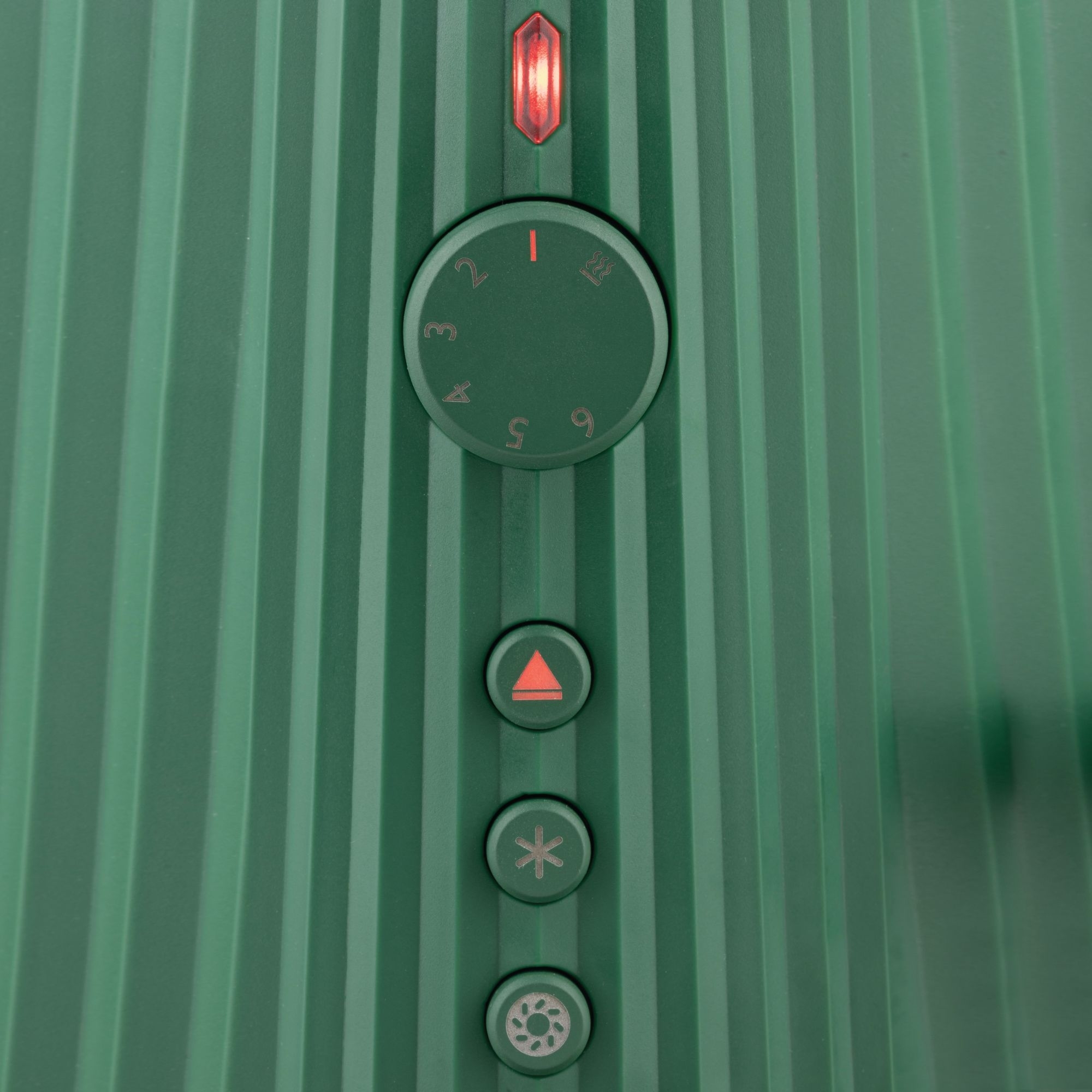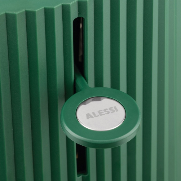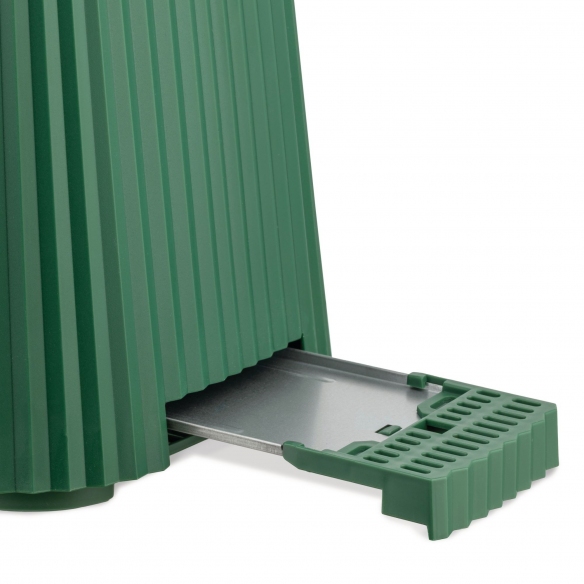 Plissé electric toaster made of thermoplastic resin with English plug. Plissé electric toaster has six different browning levels that are easy to adjust with the knob. Moreover, it has a heating and defrosting function and can also toast one-sided with the bagel function. With the stop function, the bread automatically rises as soon as they are ready. In short, this toaster is the perfect addition to your kitchen. This toaster is an object recalls a fabric that a thick pleating transforms into a three-dimensional shape; this toaster is reminiscent of an haute couture dress. The plastic and fascinating design enrich the kitchen of every type of style and the different colour variants makes it suitable for every type of furniture. Designed by Michele De Lucchi for Alessi.