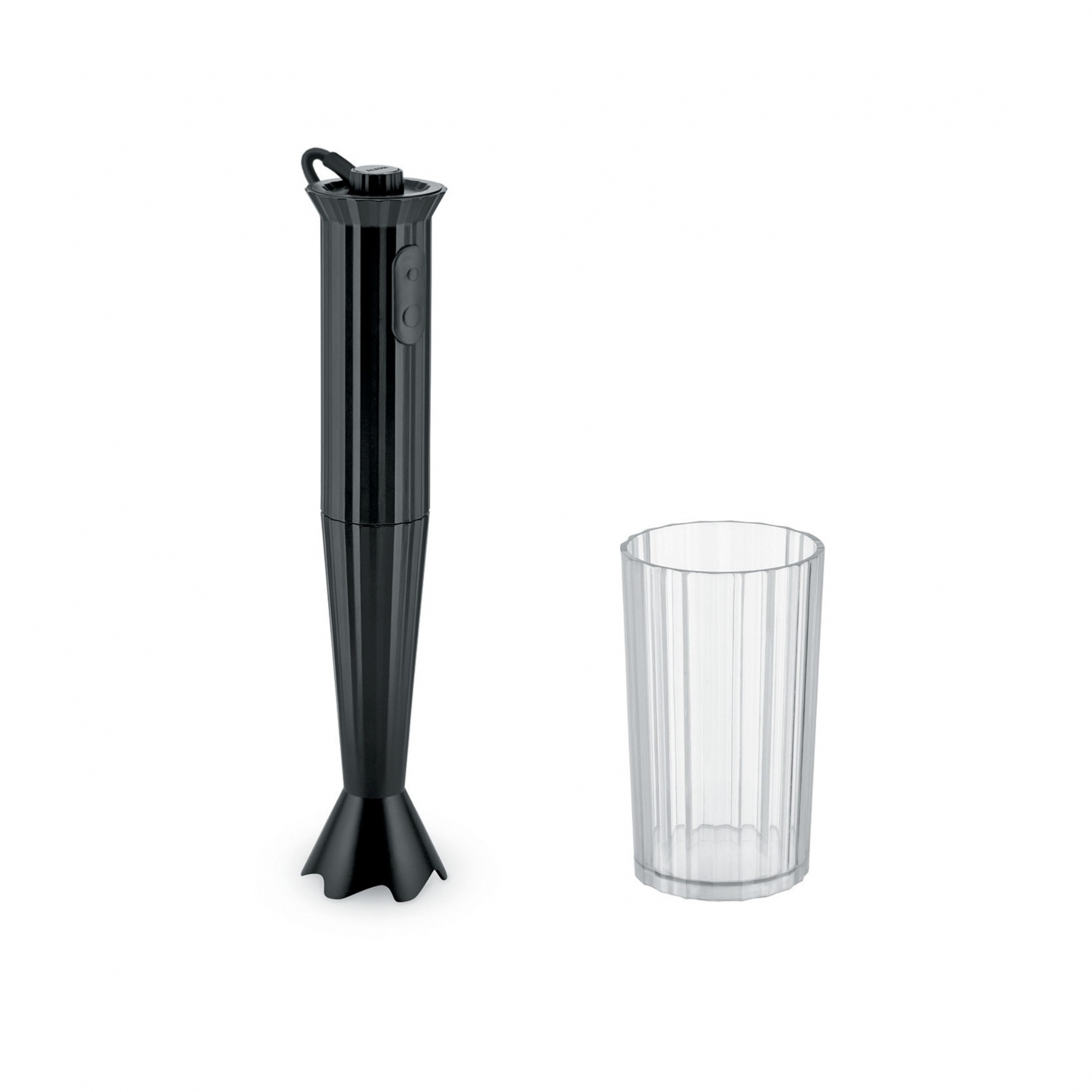 Frullatore a immersione Plissé realizzato in resina termoplastica senza spina. Il Frullatore a immersione Plissé ha una capacità di 700 ml e può essere lavato in lavastoviglie. Inoltre, è disponibile anche in una confezione completa, che include un bicchiere per mescolare, una frusta e un tritatutto universale. Questo frullatore è un oggetto che ricorda i drappeggi di un elegantissimo abito da sera. Il design plastico e affascinante, impreziosisce le cucine di ogni stile e le quattro varianti colore lo rendono adattabile ad ogni tipo di arredamento. Disegnato da Michele De Lucchi per Alessi.