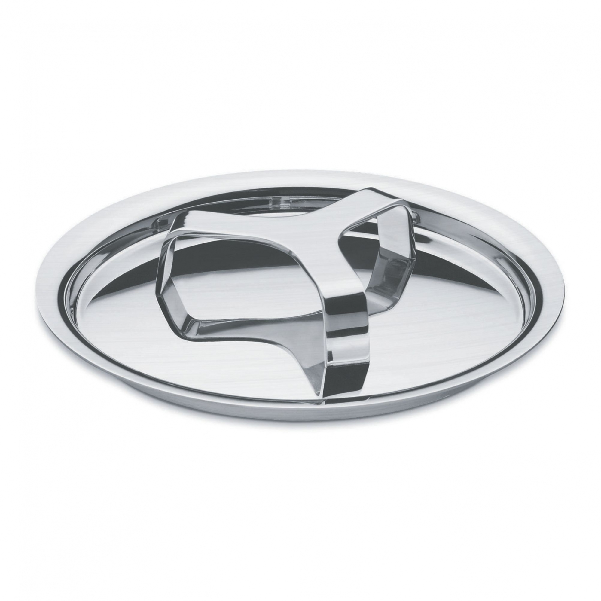 Pots & Pans lid with a diameter of 28 cm made of 18/10 stainless steel. Very practical and functional, this lid is perfect to be adapted to the Pots & Pans cookware series. The lid knob, very particular and with a triptych shape, allows easy lifting with the kitchen spoon. Designed by Jasper Morrison for Alessi.