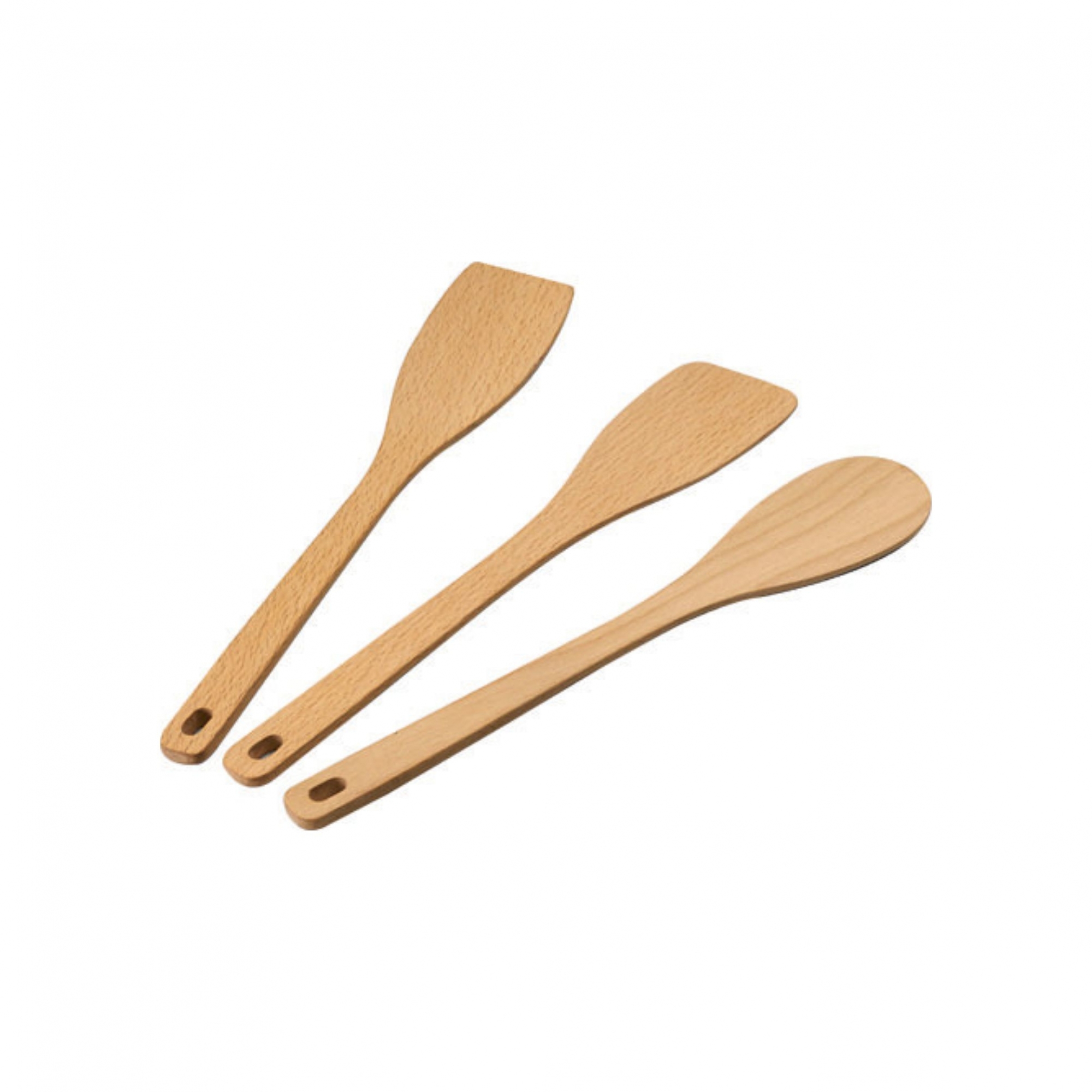 KitchenTools wooden kitchen cutlery set. The set includes a cooking spoon, a risotto spoon and a kitchen spatula, designed by Jasper Morrison for Alessi.