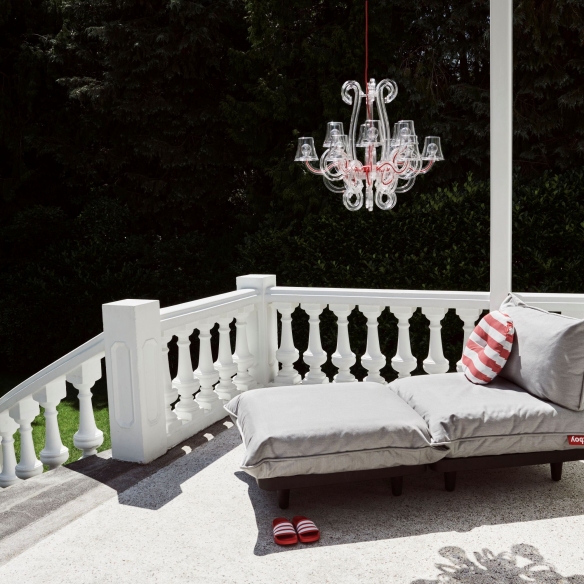 Rockcoco 12.0 pendant lamp, made of highly resistant polycarbonate. Elegant, nice and decorative, Rockcoco 12.0 is the first outdoor chandelier in the world, however it is also perfect for indoor environments. The emblematic Fatboy harness stands out, visible through the transparent outer surfaces. It can be controlled and adjusted using the special remote control, included in the package. It has an LED light source, ideal for creating magical atmospheres in your favorite environments. Ceiling kit included. Water resistant, IP44 degree of protection. 2200 Kelvin, 12X1 Watt. Made by Fatboy.