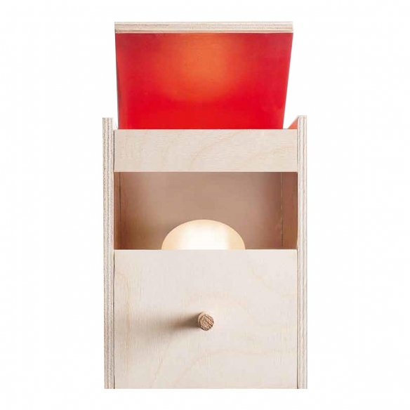 Birch plywood wall lamp with natural linseed oil finish and water-based red paint, June Bird model by Danese Milano. Dimensions: Width 12 cm, Depth 13 cm, Height 17 cm Materials: Birch plywood