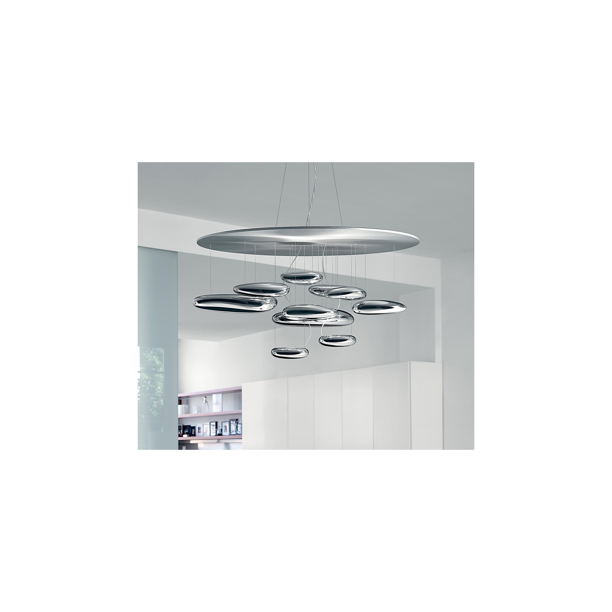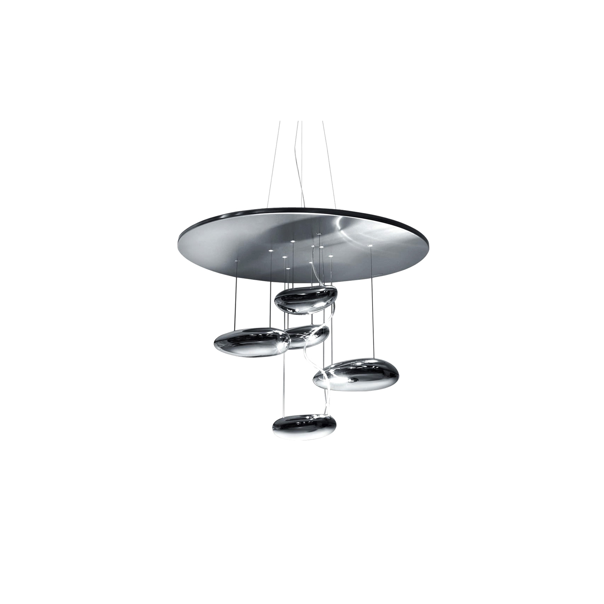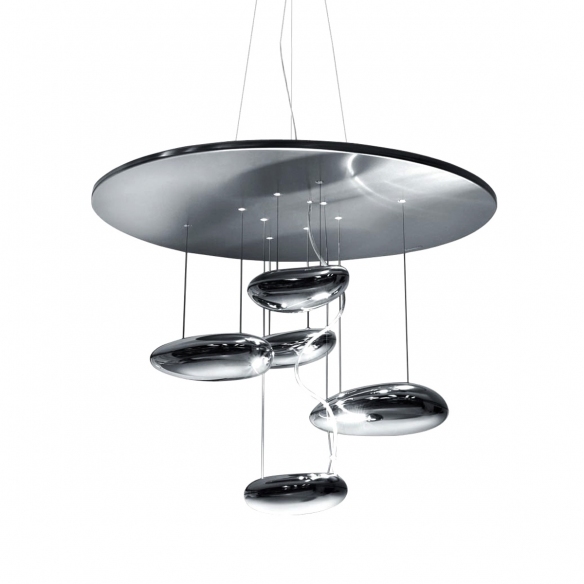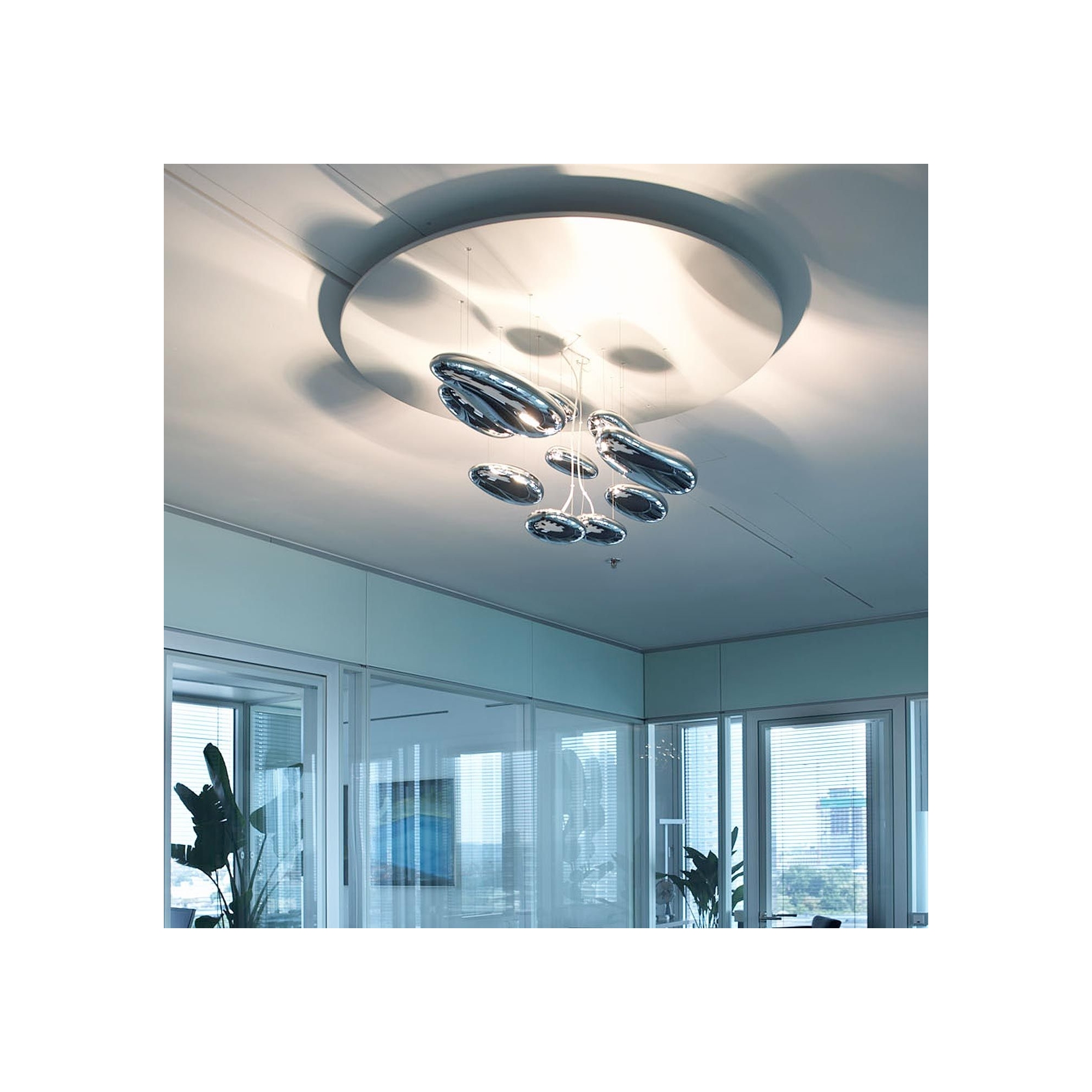 Mercury Mini Led indirect light suspension lamp with stainless steel and painted aluminum reflector, chromed aluminum lighting bodies and ABS reflectors. Gorgeous in a modern open space or in a dining area, the Mercury lamp is made up of many pebbles suspended in the air that illuminate the room with a unique and suggestive light. Light source 1x29 W - 3000° K - 4230 lm, dimmable via push system. Designed by Ross Lovegrove for Artemide.