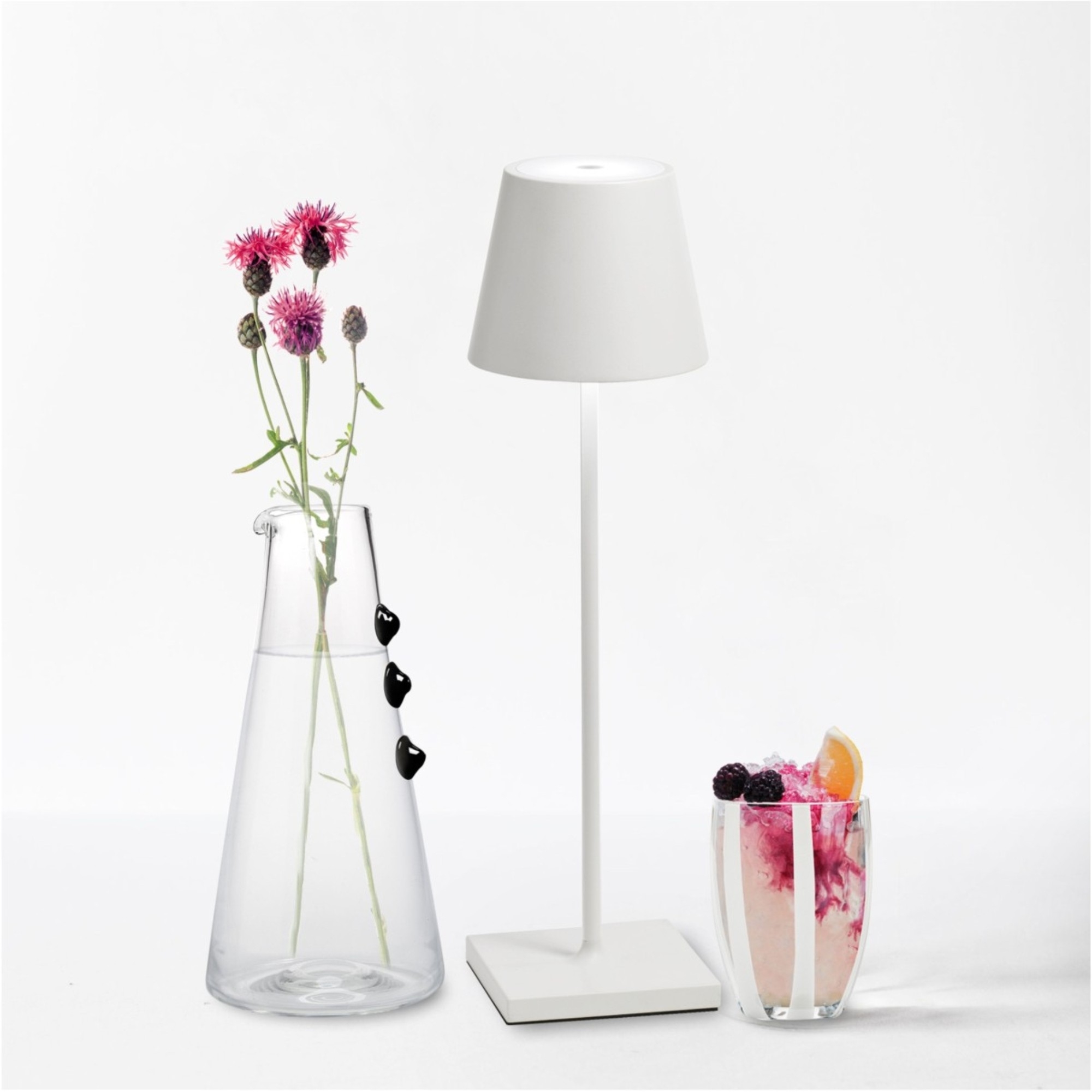 Poldina rechargeable table lamp, made with painted aluminum body and polycarbonate diffuser. Available in 15 color finishes, the Poldina Pro lamp perfectly combines design and functionality. The compact and elegant lines make it perfect for any environment, both indoor and outdoor, thanks to the IP65 degree of protection. It has a rechargeable battery and a LED source that turns on and off using the special touch button on the top of the diffuser. Battery life guaranteed for over 9 hours. Charging base supplied. Made by Zafferano.