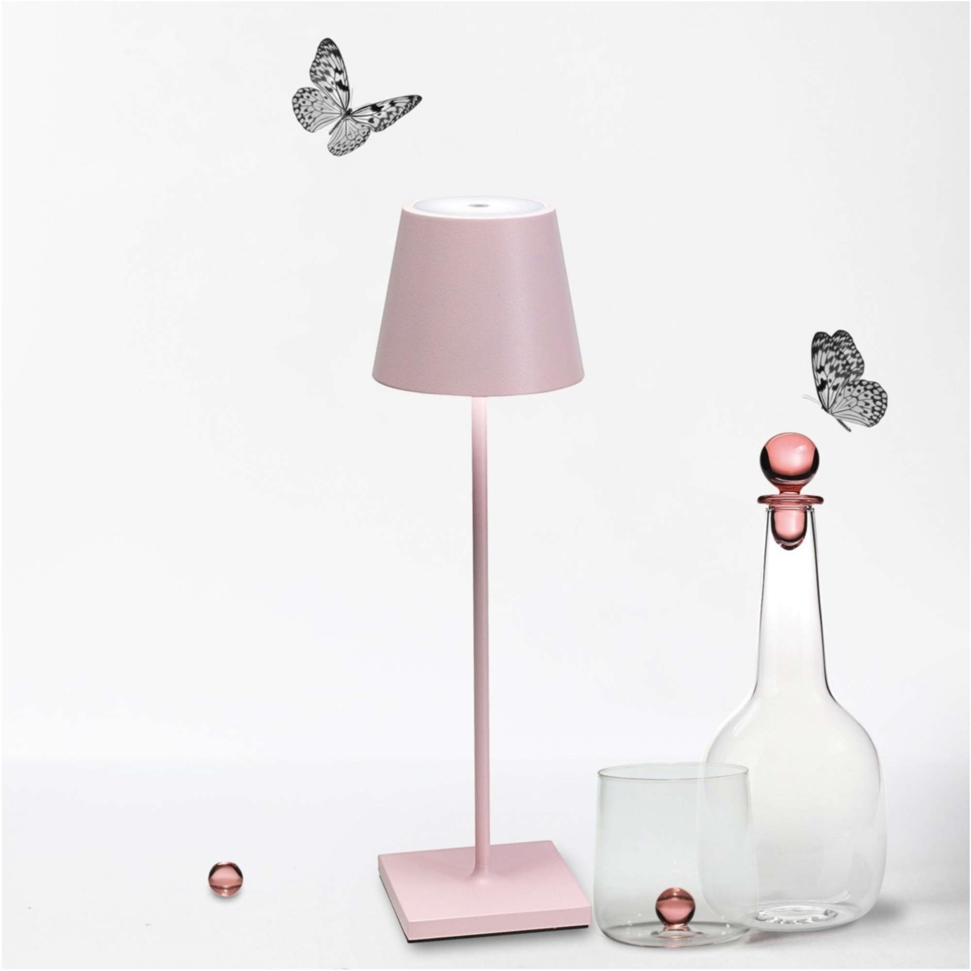 Poldina rechargeable table lamp, made with painted aluminum body and polycarbonate diffuser. Available in 15 color finishes, the Poldina Pro lamp perfectly combines design and functionality. The compact and elegant lines make it perfect for any environment, both indoor and outdoor, thanks to the IP65 degree of protection. It has a rechargeable battery and a LED source that turns on and off using the special touch button on the top of the diffuser. Battery life guaranteed for over 9 hours. Charging base supplied. Made by Zafferano.