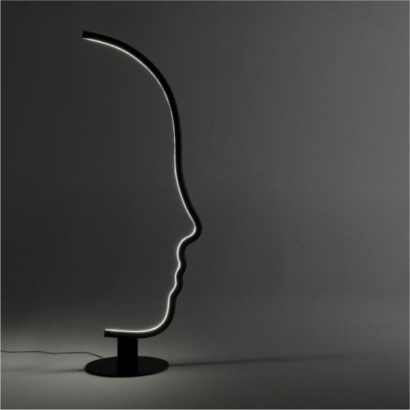 Vis a Vis Ground LED Lamp with shaped wooden structure and metal base, designed by Gregorio Facco for Mogg