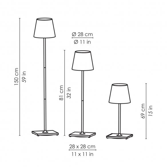 Floor and table rechargeable lamp with painted aluminium body and polycarbonate diffuser. 10 W LED bulb light 3000 ° K dimmable, designed by Federico De Majo for Zafferano. Dimensions: Base 28x28 cm, Height 69/81/150 cm, Diffuser diameter 28 cm Materials: Aluminium, Polycarbonate