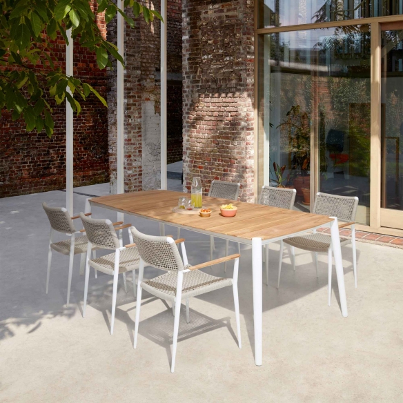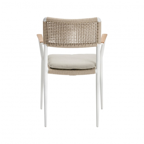 The Ray dining side chair, with Teak armrests, is crafted from materials of the highest quality, from its robust aluminum structure to the Teak wood armrests that lend a warm and modern appeal to the chair, making it perfectly compatible with dining tables that have a Teak wood surface. This Ray dining side chair has been designed with an innovative vision, as it combines elegance, durability, and comfort into a unique furnishing solution. Ray is available in four beautiful colors, making it versatile enough to complement any decor style, from minimalist to more classical. Moreover, the side chair is perfectly stackable, making it ideal for hotels or restaurants. Diphano pays meticulous attention to every detail, from the design of the side chair to the selection of fabrics, making Ray with Teak armrests a sought-after item for those looking for an outdoor dining side chair that can create a welcoming and comfortable atmosphere. Ray is pleasingly elegant to look at and utterly functional; the seat and back are made from handwoven, durable ropes, adding a natural touch. The Ray dining side chair with Teak armrests embodies the essence of sophistication and versatility for outdoor spaces. Relax in this soft, timeless jewel.