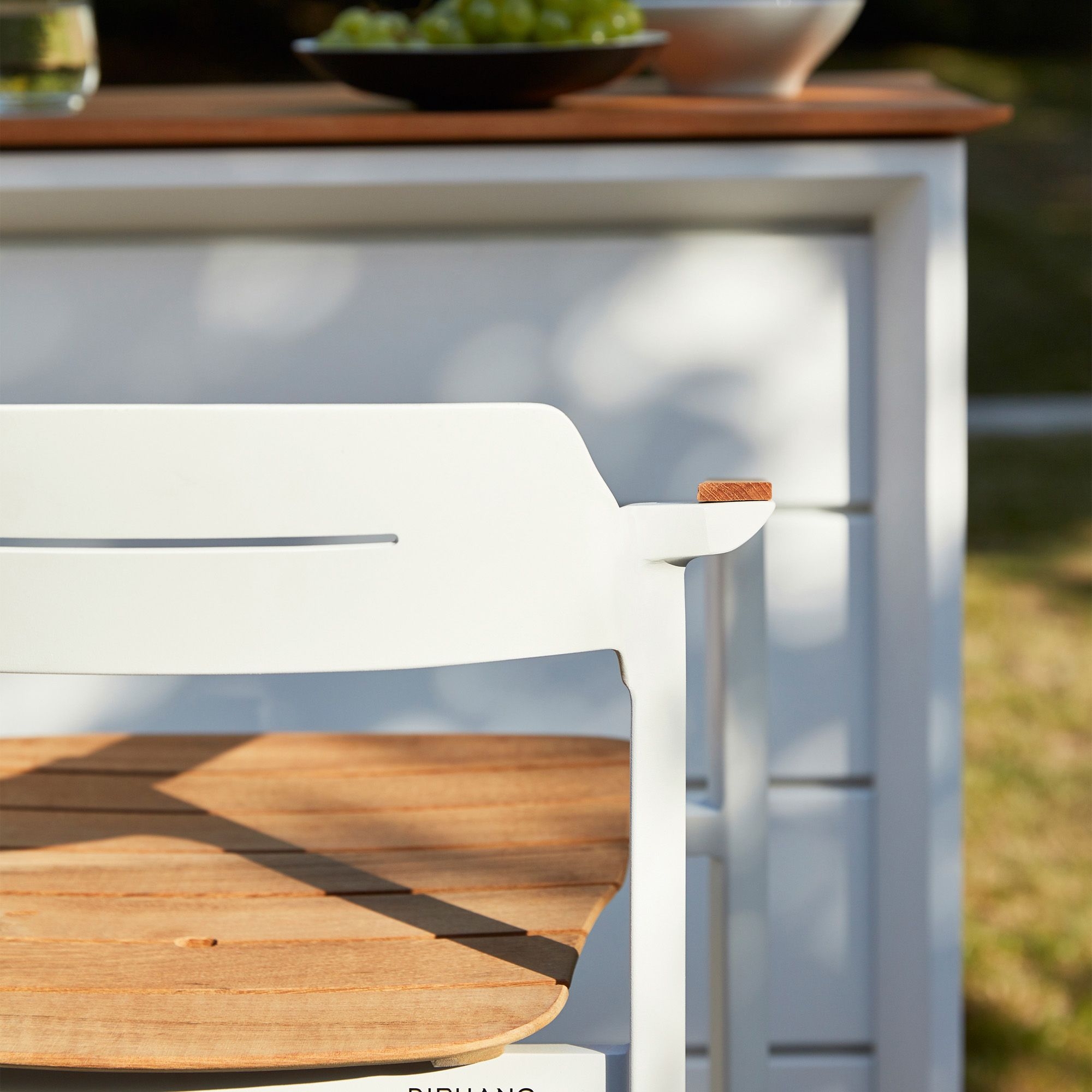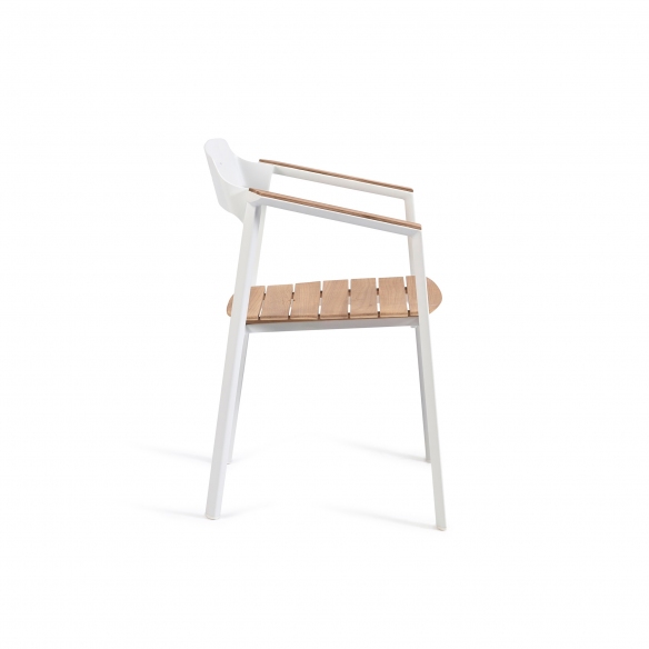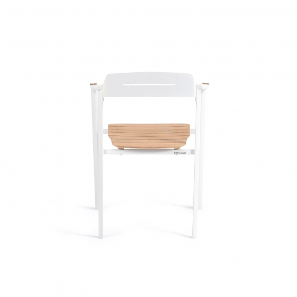 The Diphano Icon dining armchair has been meticulously crafted with the highest quality materials such as aluminum, which provides a robust and lightweight structure that is easy to move, and the prized Teak wood, which keeps the chair beautiful, elegant, and resistant to various climate changes like rain, UV rays, or humidity. This combination of aluminum and Teak gives the dining armchair a warm and natural feel and can be paired with dining tables featuring a Teak top. Available in four splendid colors, the outdoor Icon dining armchair is designed to complete any outdoor space, whether a garden with a pool or a modern-style terrace; Icon perfectly matches all styles and decors. Every aspect of this outdoor dining armchair has been meticulously considered, from the ergonomics of the backrest that supports a relaxed posture to the armrests that provide stability and additional comfort. Diphano's Icon is perfect for reading a book, dining with friends and family, or peacefully enjoying the sounds of nature. The Icon dining armchair is the perfect blend of functionality and aesthetics.