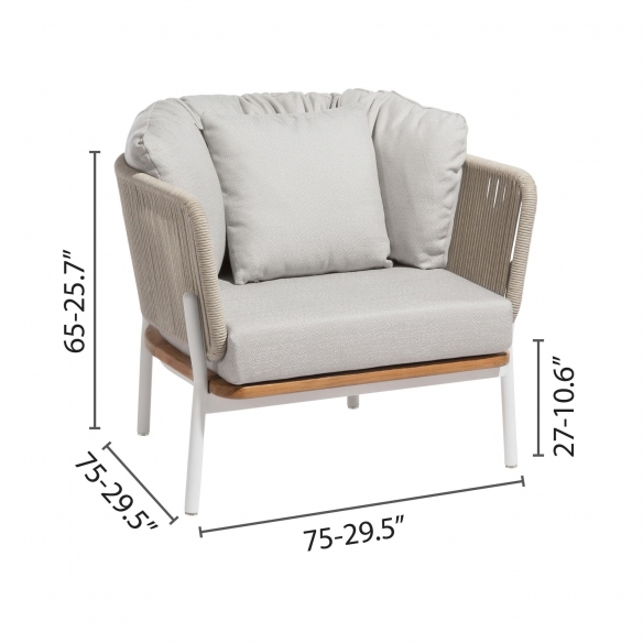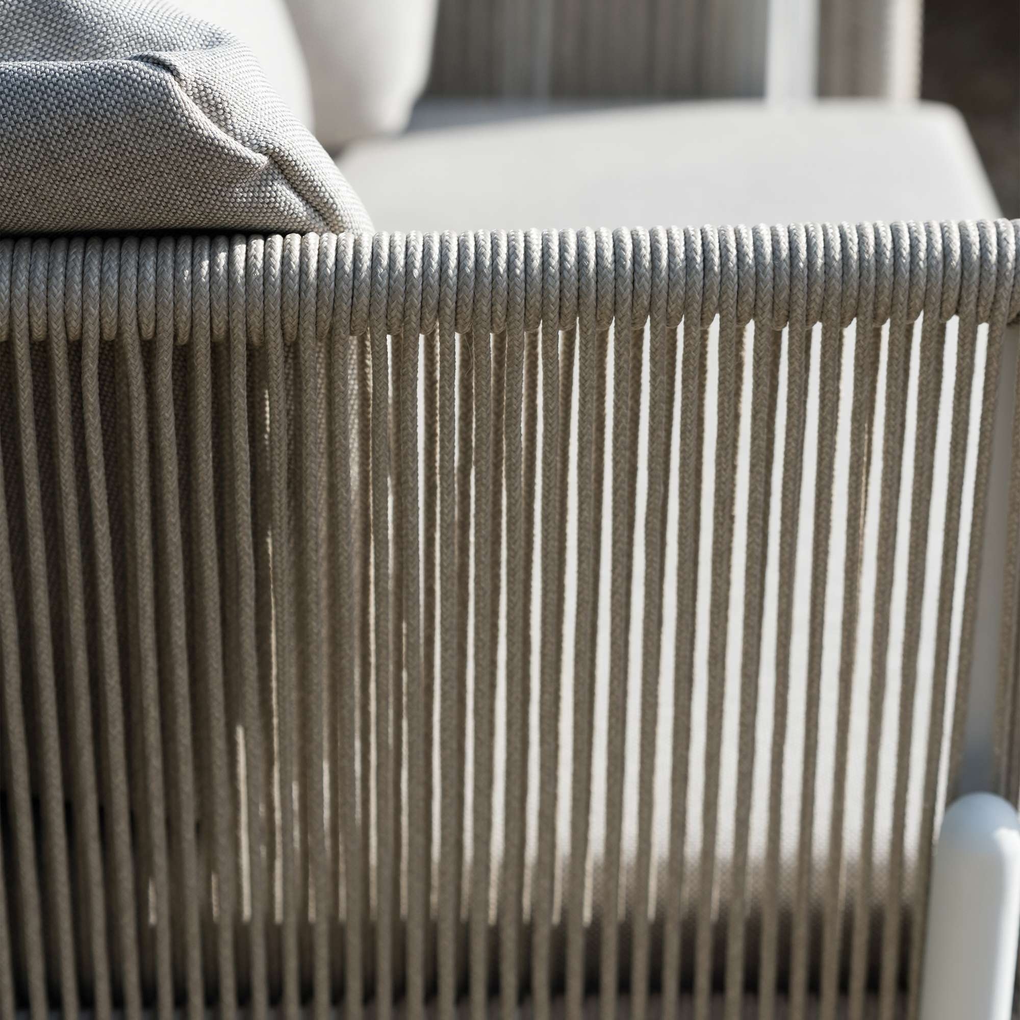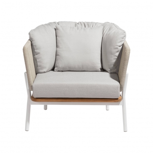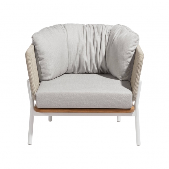 The Omer lounge chair, with integrated cushions, has a sturdy aluminum structure that promises durability and easy maintenance. The Omer outdoor lounge chair is available in two beautiful colors, capable of blending harmoniously into any context, from the classic dining room to the more modern bedroom setting. The ultra-soft cushions have been crafted in high-quality fabric that invites relaxation and comfort. The Omer lounge chair is perfect for turning your room into a veritable art gallery. Thanks to its unique and irresistible design, Omer is an ideal choice for those looking for style, comfort, and functionality in a single item. The Omer lounge chair has a simple yet sophisticated design and is perfect for both indoor and outdoor use, thanks to its timeless durability. This lounge chair features a distinctive rope finish, creating an intense and elegant look. Don't miss out on this gem; create your own oasis of relaxation with the Omer lounge chair with integrated cushions.