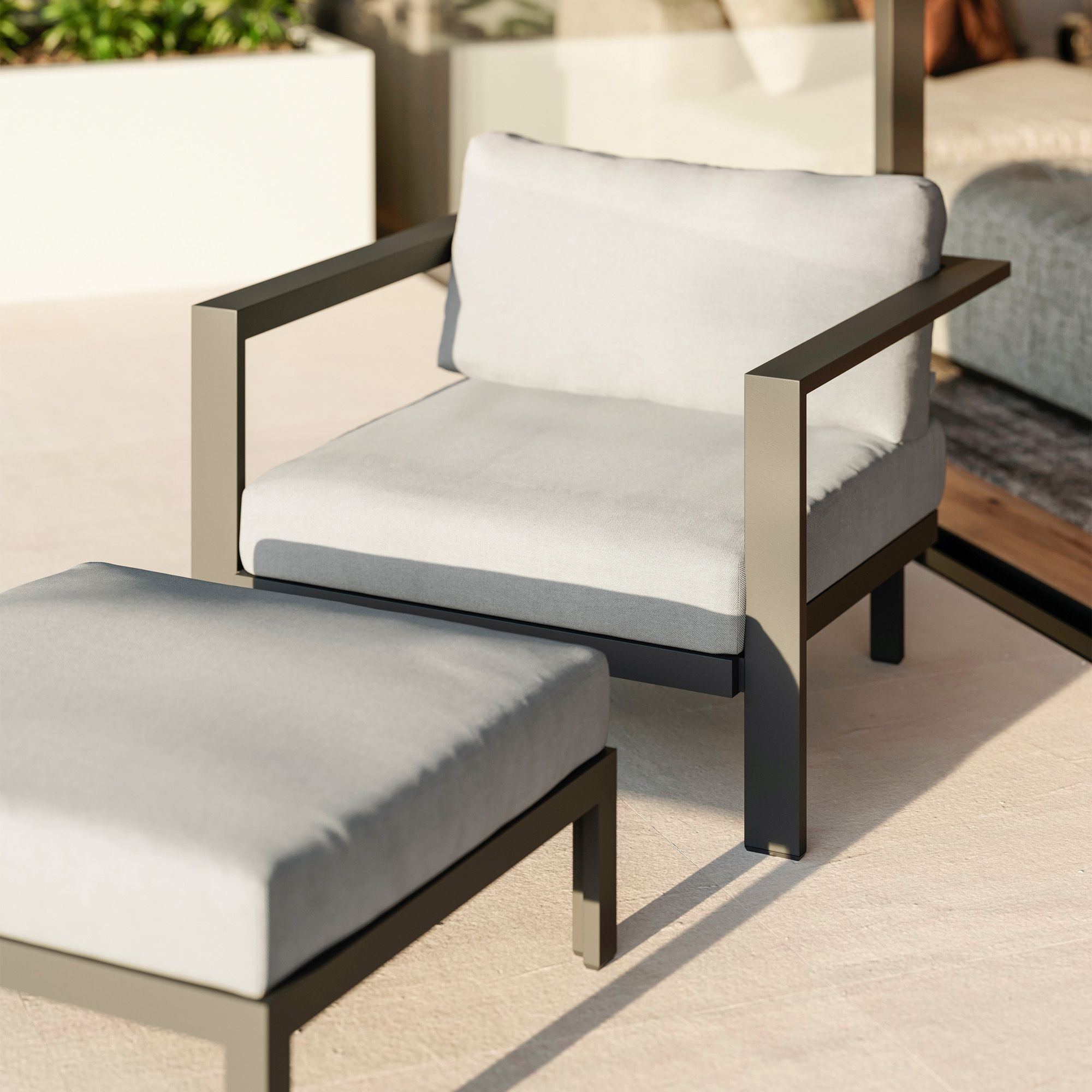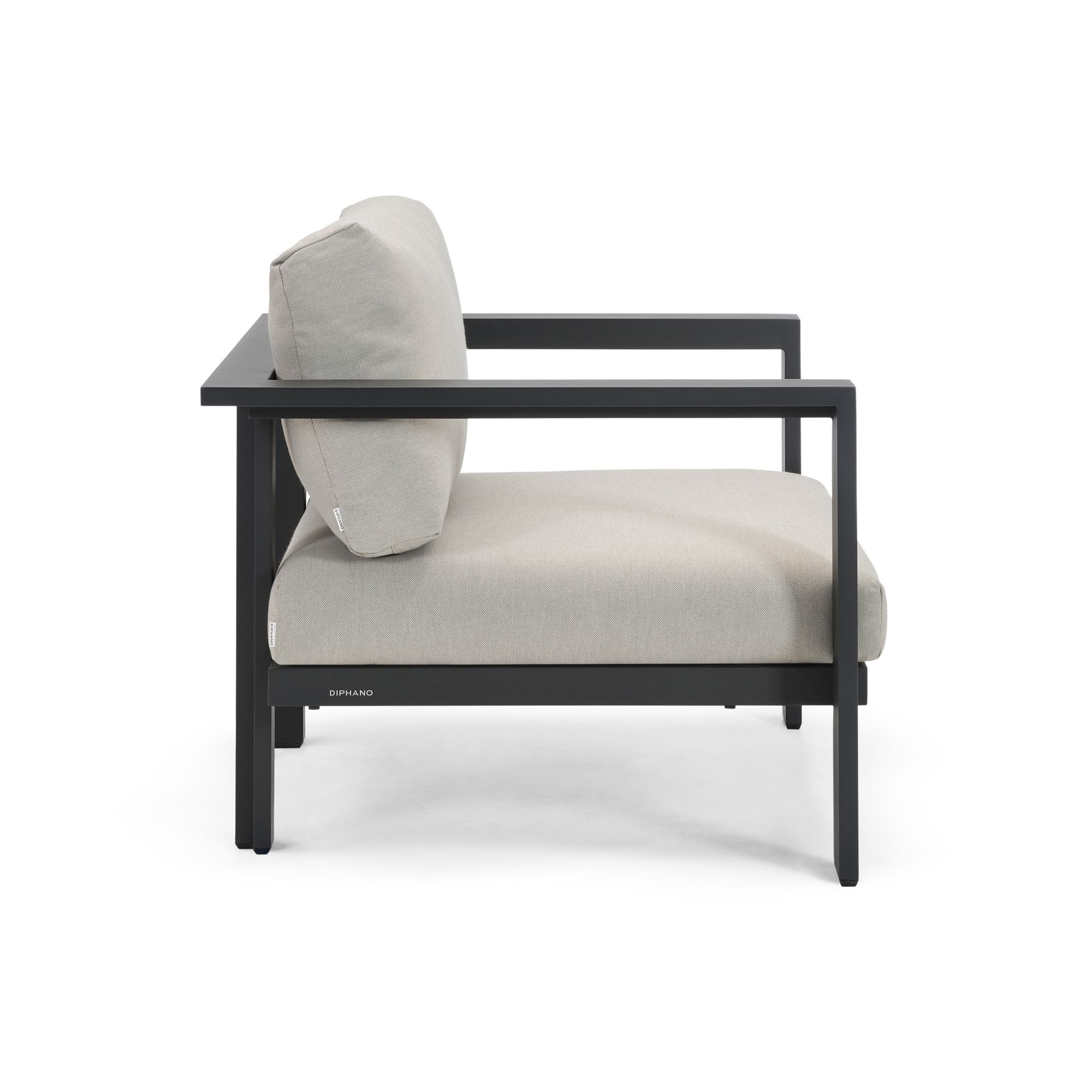 The Cubic lounge chair, with integrated cushions, is a wonderful masterpiece created by Diphano with a robust aluminum frame and cushions covered in high-quality fabric, capable of withstanding various weather conditions, from hot sun to incessant rain. Cubic is customizable in six different colors, making it versatile and capable of matching any style of your home. The Cubic outdoor  lounge chair stands out for its minimalist and modern design, making it an excellent choice for those looking to add a bit of contemporary elegance to their outdoor or indoor space. A unique feature of the Cubic armchair is the Velcro attachment; this way, the cushions stay in place but are also easily removable for maintenance and cleaning of the outdoor lounge chair. Additionally, its versatility allows it to be placed in both outdoor environments, like a terrace or garden, and indoor settings, such as a dining room or living room, thanks to its high-quality materials that can withstand climatic changes. Besides its design and various functionalities, Cubic is committed to environmental sustainability, with eco-friendly materials that respect nature without compromising on aesthetic appeal. Choose the Cubic  lounge chair with integrated cushions, and you won't regret it.