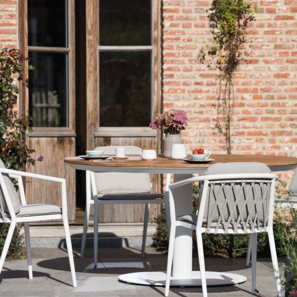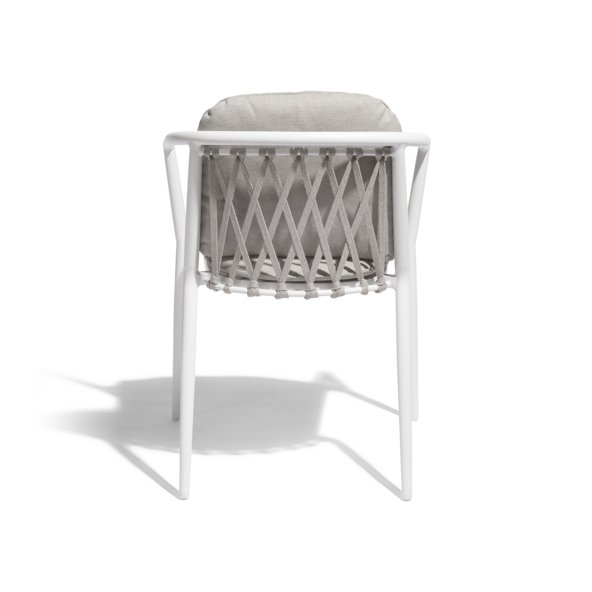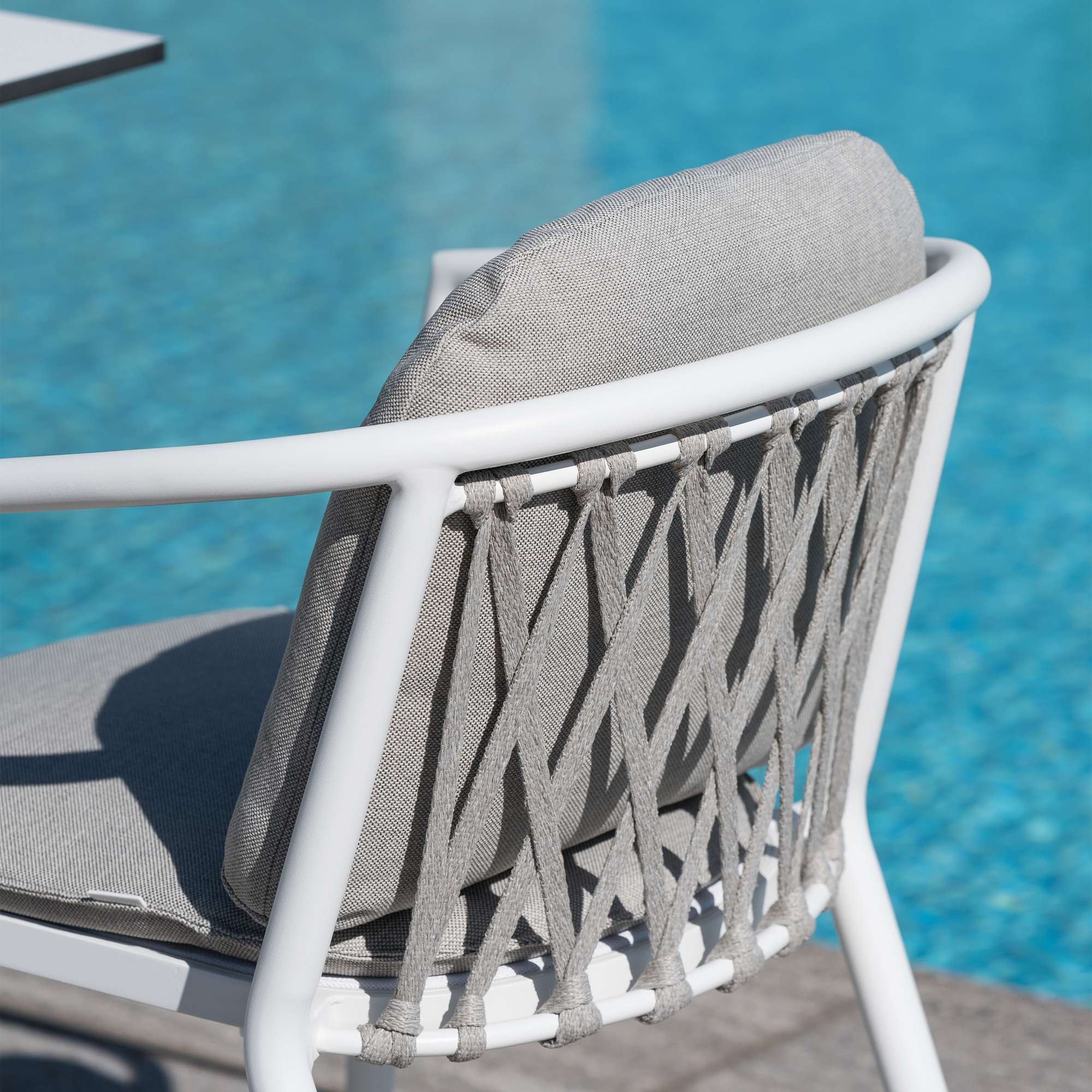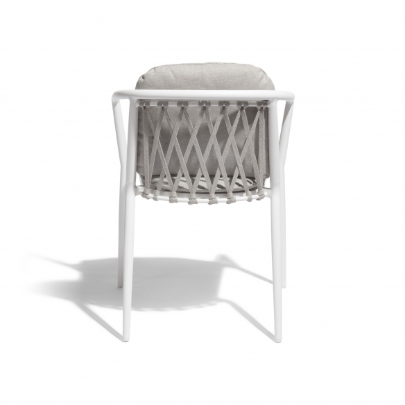 The Diamond dining armchair features a high-quality aluminum structure, designed to withstand outdoor elements such as heat and humidity, ensuring long-lasting durability and beauty over time. The Diamond outdoor dining armchair is available in four magnificent colors; making it versatile for any type of outdoor space, be it a small terrace, a large garden, or a balcony. This elegant outdoor dining armchair is the result of innovation in outdoor furniture, combining functionality and aesthetics. The rope finish pattern turns this dining armchair into a true jewel with a graceful look. The armrests of this wonderful jewel have been designed to make Diamond an oasis of comfort, offering maximum support and relaxation. Diamond is the epitome of furniture that defines the light and playful style of this collection. Choosing this outdoor dining armchair means embracing a luxurious aesthetic and timeless comfort for your terrace, turning it into a personal paradise corner.