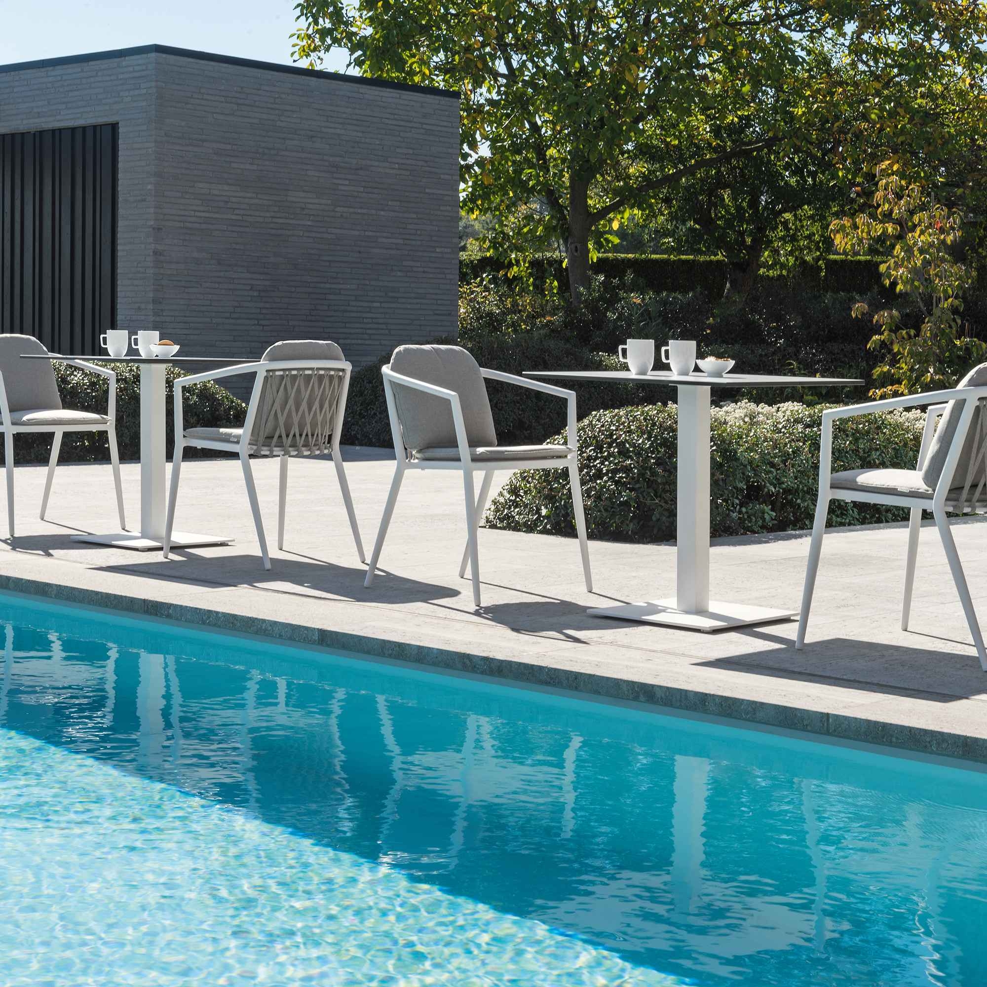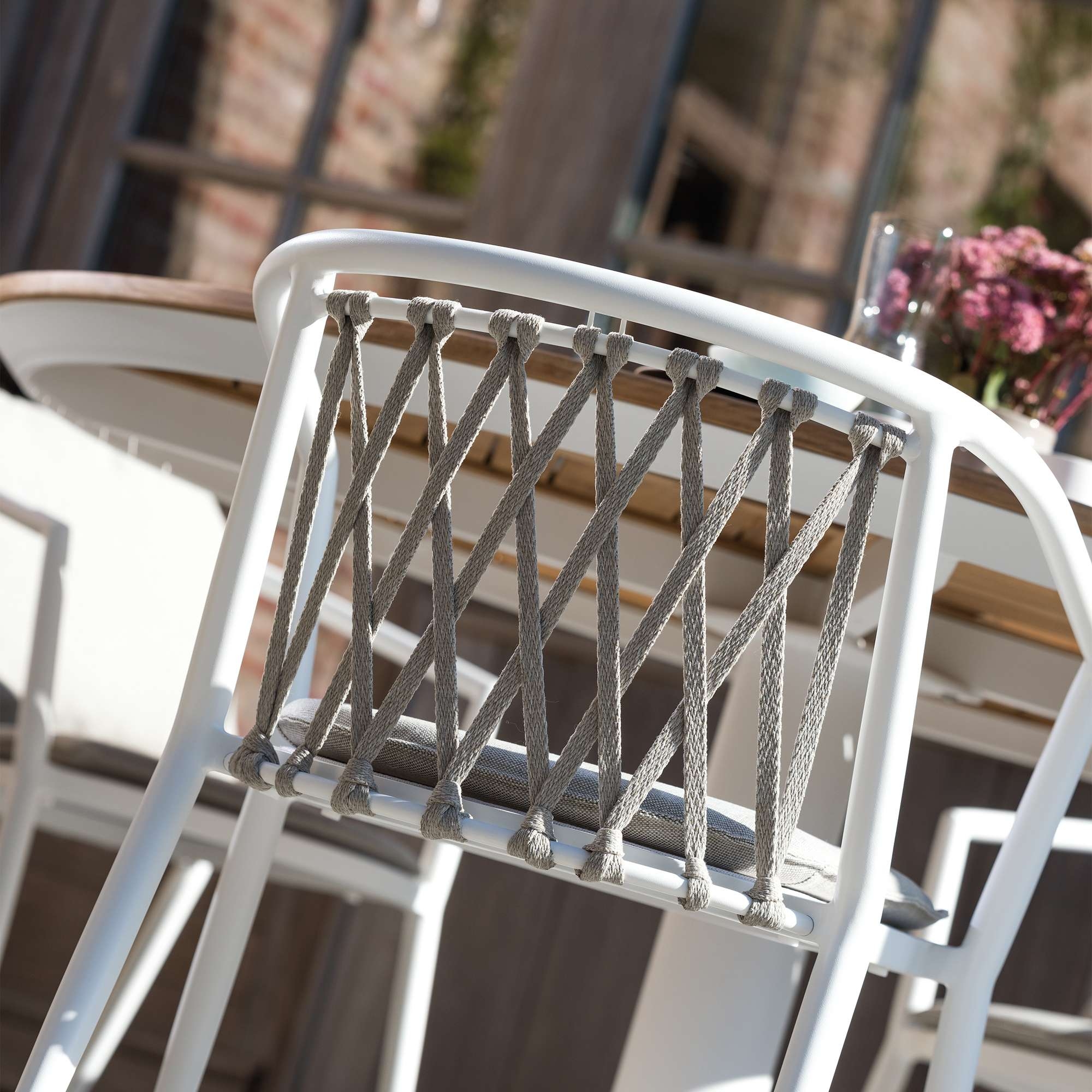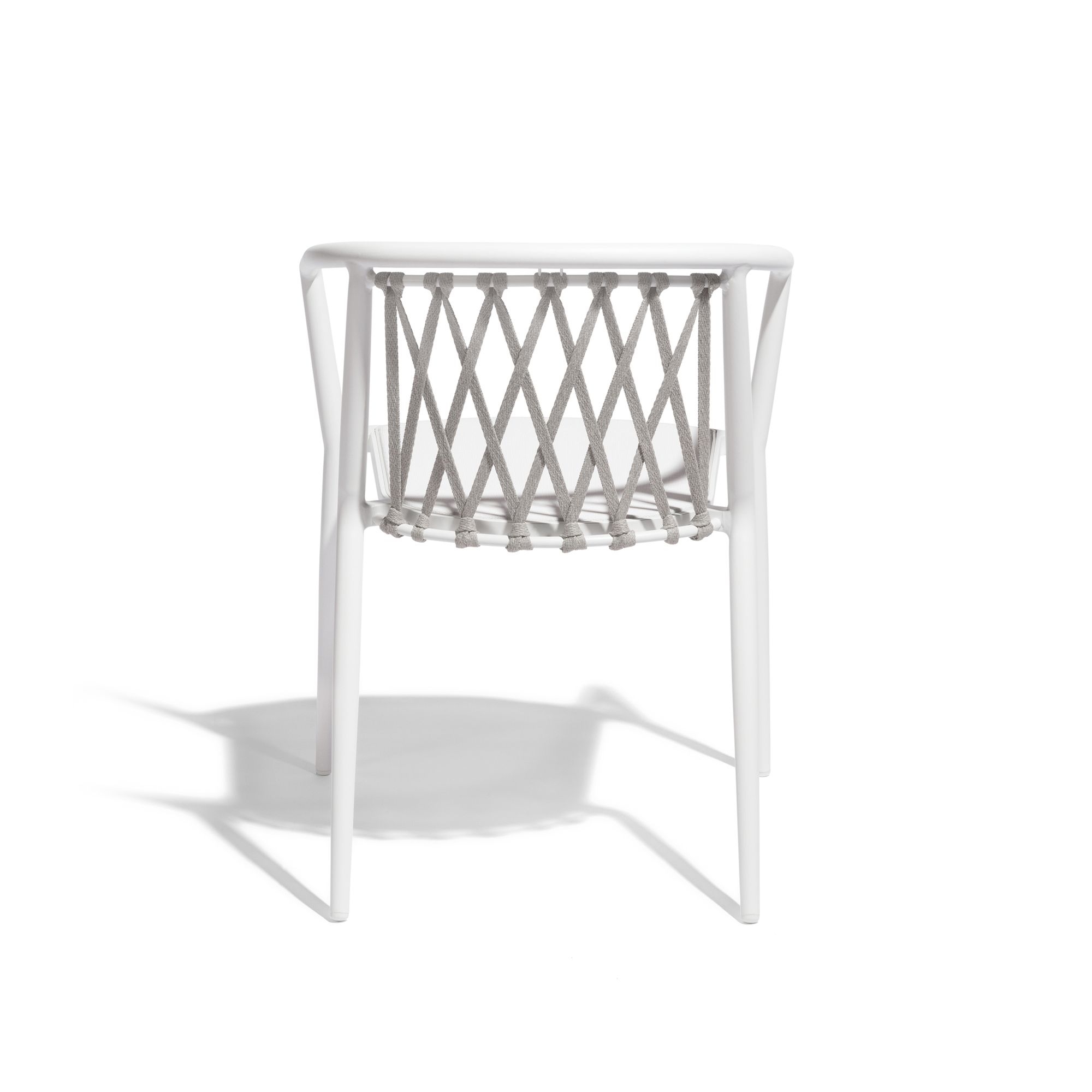 The Diamond dining armchair features a high-quality aluminum structure, designed to withstand outdoor elements such as heat and humidity, ensuring long-lasting durability and beauty over time. The Diamond outdoor dining armchair is available in four magnificent colors; making it versatile for any type of outdoor space, be it a small terrace, a large garden, or a balcony. This elegant outdoor dining armchair is the result of innovation in outdoor furniture, combining functionality and aesthetics. The rope finish pattern turns this dining armchair into a true jewel with a graceful look. The armrests of this wonderful jewel have been designed to make Diamond an oasis of comfort, offering maximum support and relaxation. Diamond is the epitome of furniture that defines the light and playful style of this collection. Choosing this outdoor dining armchair means embracing a luxurious aesthetic and timeless comfort for your terrace, turning it into a personal paradise corner.