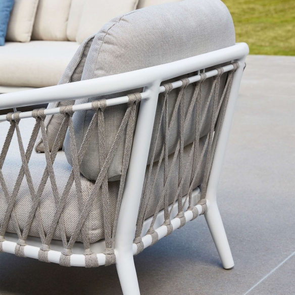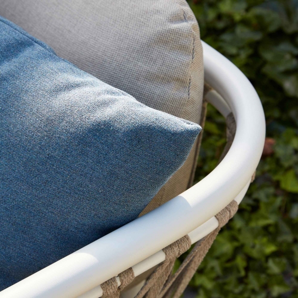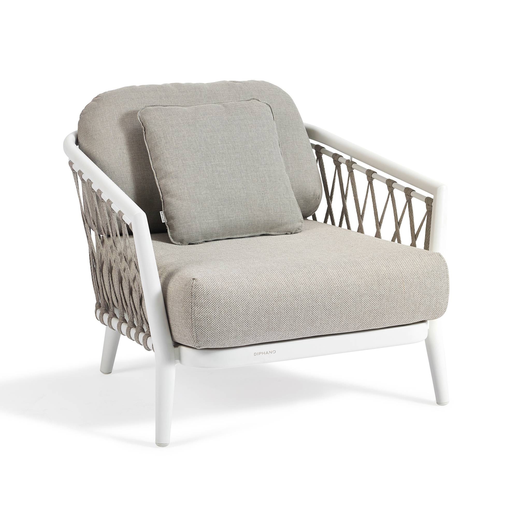 The Diamond lounge chair, with integrated cushions, features a frame made of the highest quality aluminum, designed to resist outdoor weather conditions such as heat and humidity, ensuring long-lasting durability and beauty over time. The Diamond outdoor lounge chair is available in two stunning colors; this makes it versatile for any type of outdoor space, whether it's a small terrace, a large garden, or a balcony. This elegant outdoor lounge chair is the result of innovation in outdoor furniture, combining functionality and aesthetics. The Diamond lounge chair's cushions are soft and thick, made from fabrics capable of resisting UV rays, rain, and climate changes, always ensuring an impeccable look. The armrests of this wonderful masterpiece have been designed to make the Diamond a haven of comfort and to offer maximum support and relaxation. Diamond is the epitome of furniture that defines the light and playful style of this collection. Choosing this outdoor lounge chair means embracing a luxurious aesthetic and timeless comfort for your terrace, turning it into your personal paradise corner.