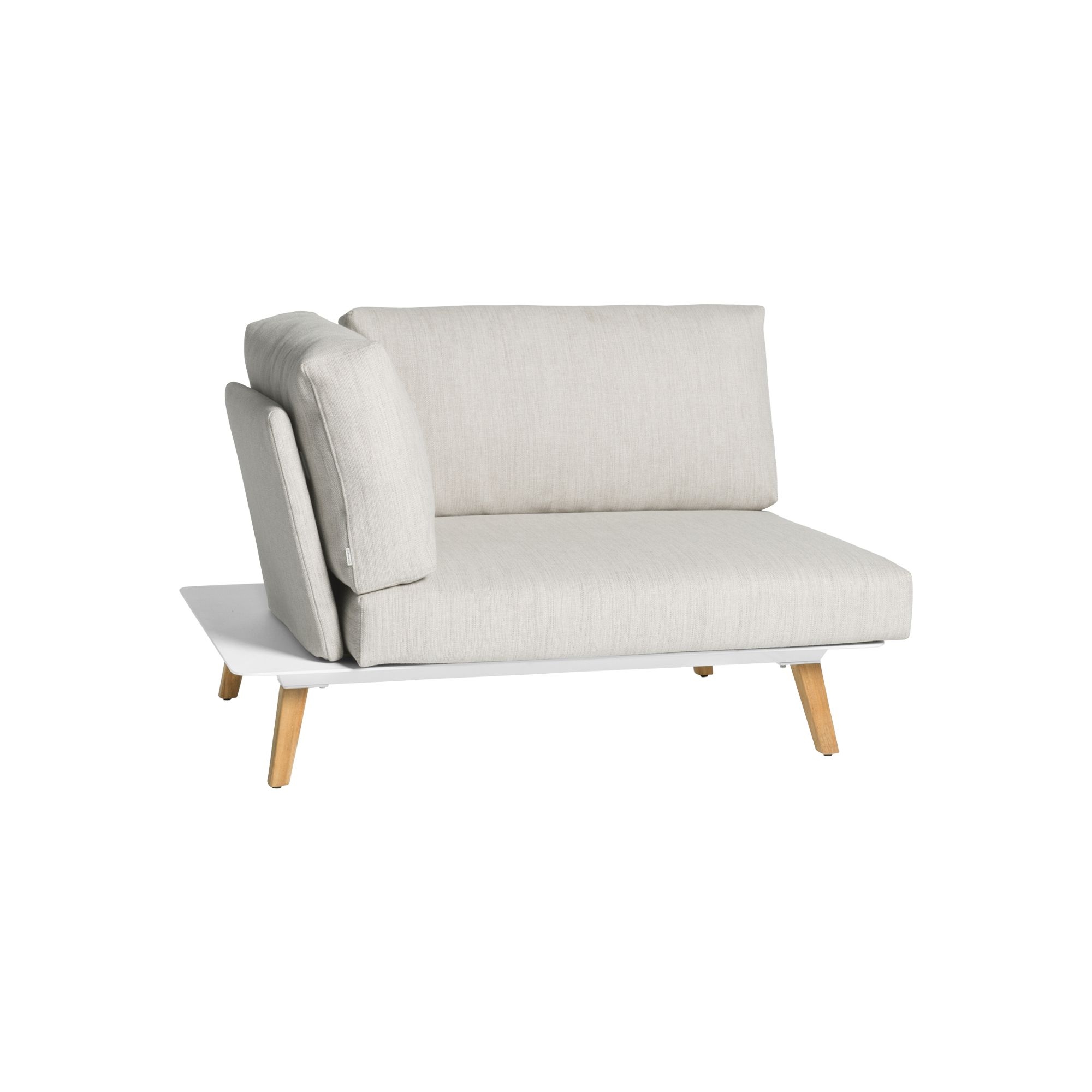 The Link right corner seat, 120 cm, with cushions included, is made from the highest quality materials: it features a sturdy aluminum structure that ensures stability and support, the exquisitely delicate Teak wood that promises durability, and the padded fabric that delivers supreme softness and comfort. This outdoor seat is an ideal choice for those who want to combine quality and refinement. The Link right corner seat is perfect for maximizing space in the home, especially in larger open-plan areas, providing an elegant and sophisticated furnishing solution. The Link seat includes cushions, soft clouds made from high-quality fabric, easily removable for washing thanks to Velcro fastenings, offering an irresistible welcome to anyone wishing to relax. Link is a seat that enhances any type of environment with its impeccable and comfortable style, whether it's a veranda or a living room. Its design, characterized by clean and modern lines, perfectly adapts to various decorating styles, from the most classic to the most modern. Choosing this Link right corner seat is not only aesthetically pleasing but also extremely practical and functional.