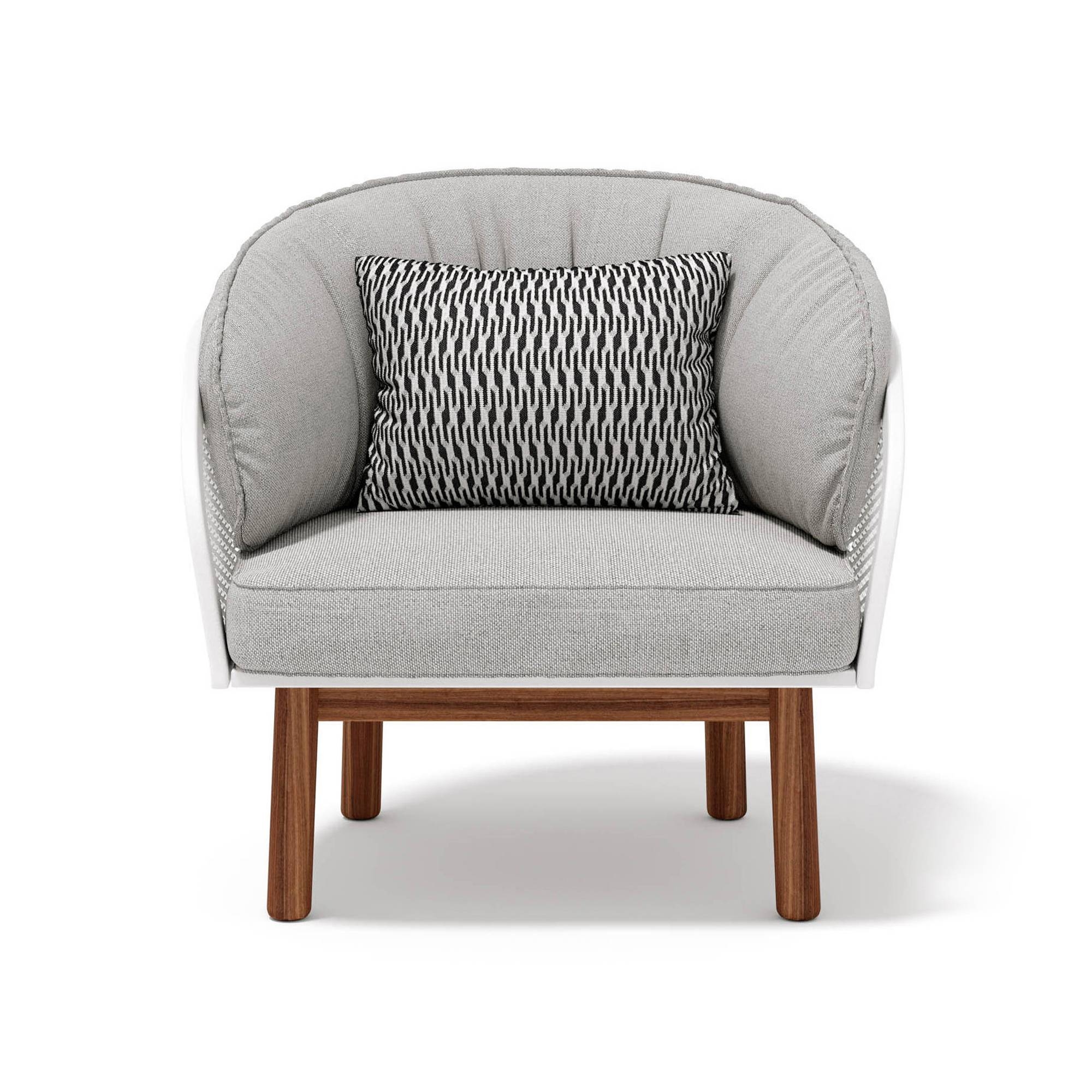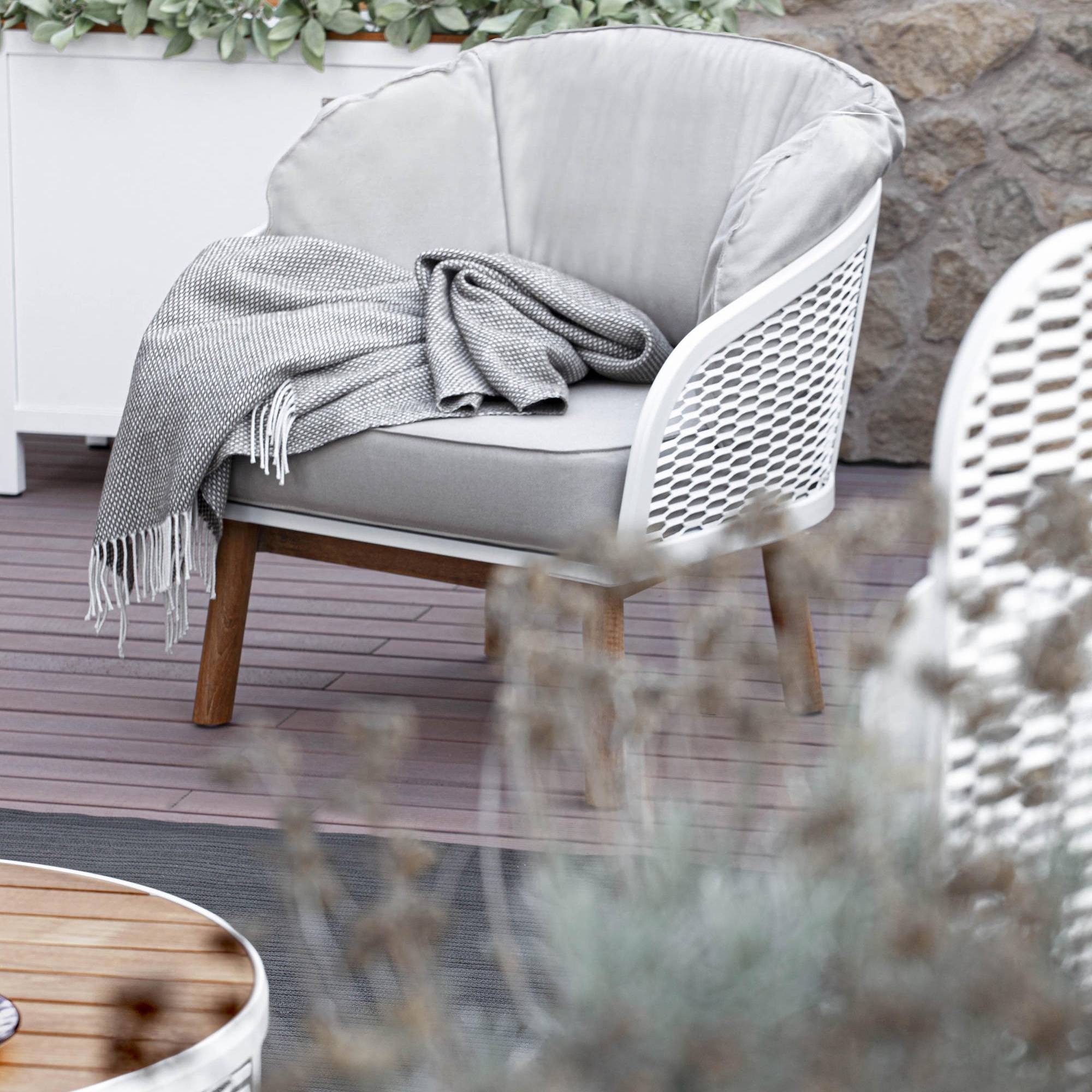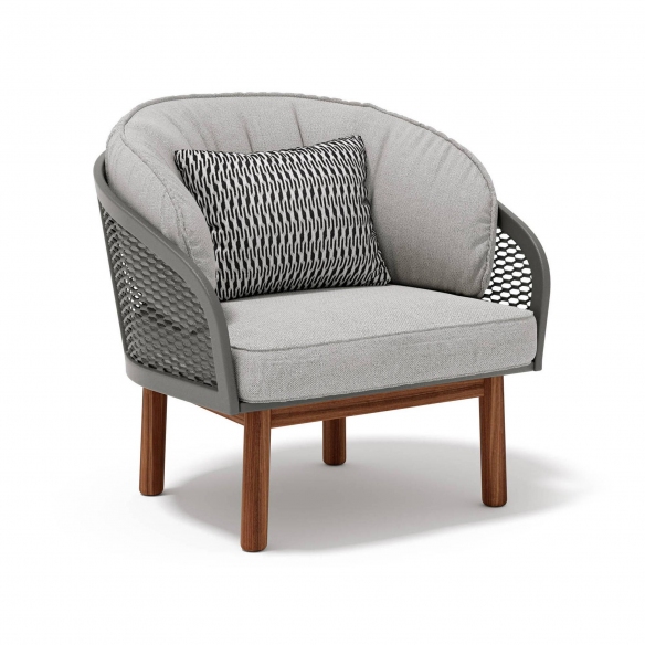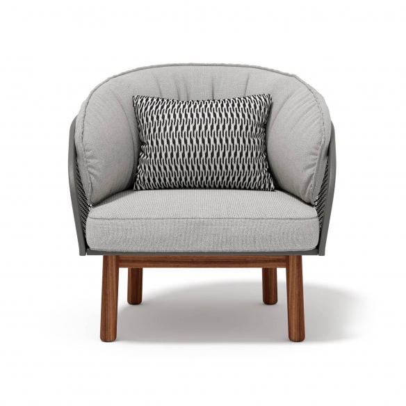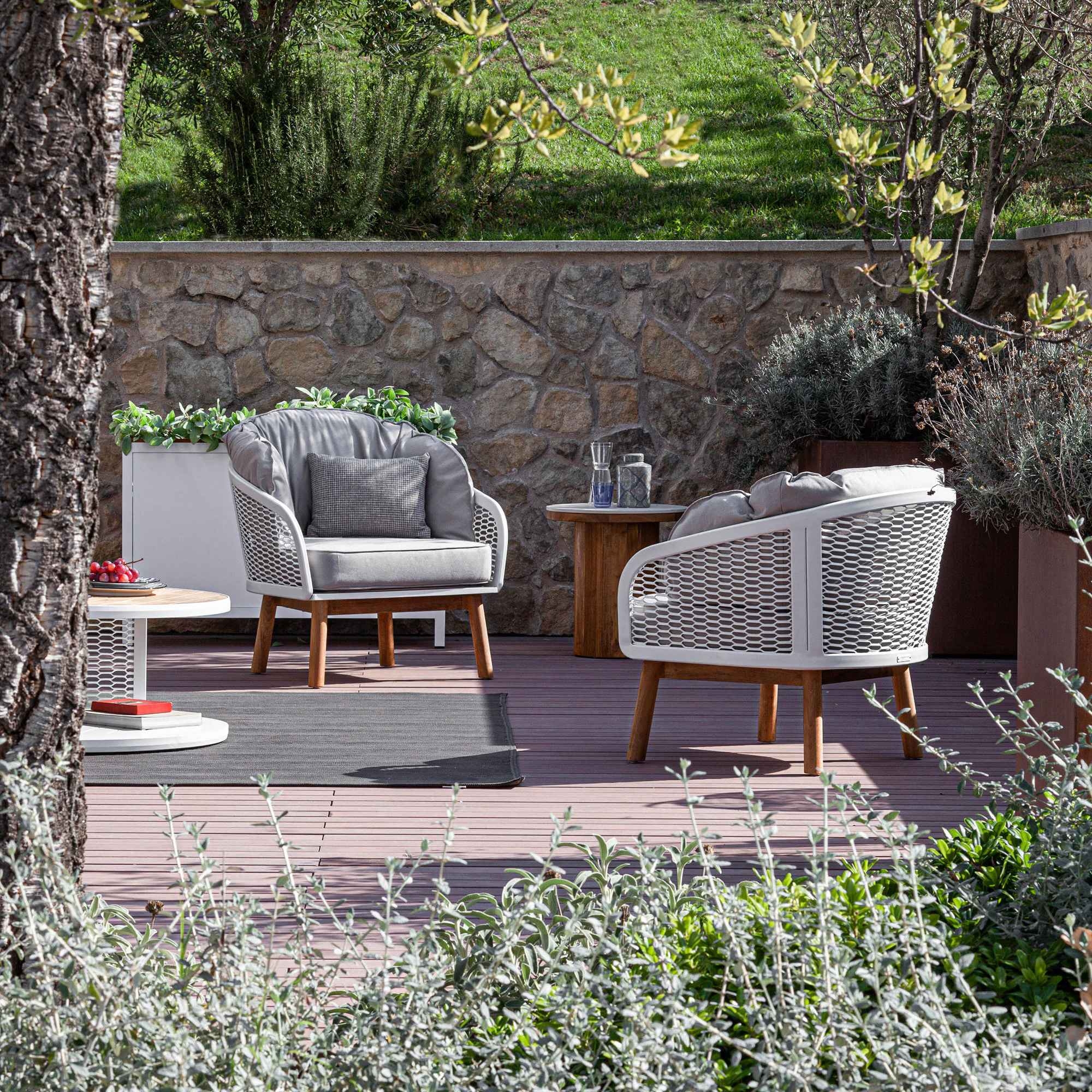The Cyrano outdoor armchair, featuring an aluminum shell, teak base and seat and back cushions upholstered in outdoor fabric, comes in a wide array of color combinations. This outdoor armchair is inspired by the legendary figure of Cyrano de Bergerac, the brave and bold swordsman with a penchant for poetry and an undying love for Roxane. This collection perfectly embodies Cyrano's dual spirit, blending robust and materially impactful elements with poetic sophistication. The armchairs and sofas from the Cyrano collection stand out with their enveloping aluminum shell, incorporating ergonomic and soft cushions. These cushions evocatively spill over the backrest, reminiscent of the delicate petal of a flower. The design is not only a tribute to Cyrano's passion for beauty and art but also ensures unmatched comfort, inviting relaxation and contemplation in your outdoor spaces. The Cyrano outdoor armchair thus proves to be an ideal choice for those looking to furnish their outdoor spaces with pieces that have a strong personality, capable of telling a story and creating a welcoming and refined atmosphere. Perfect for terraces, gardens, or any outdoor area, this armchair will undoubtedly enhance the overall aesthetic of the environment with its unique balance of strength and delicacy, between adventure and poetry. Designed by Atmosphera Creative Lab.