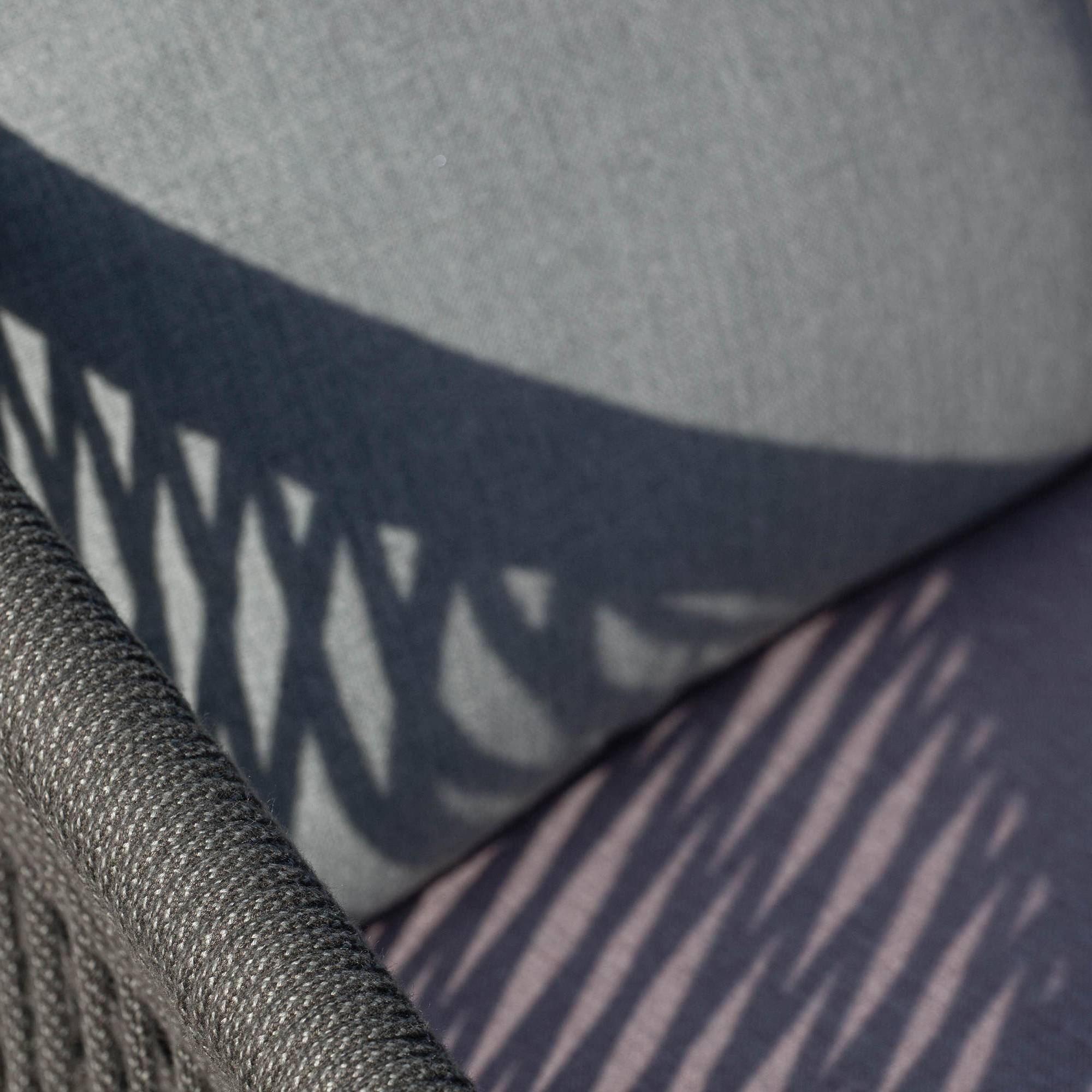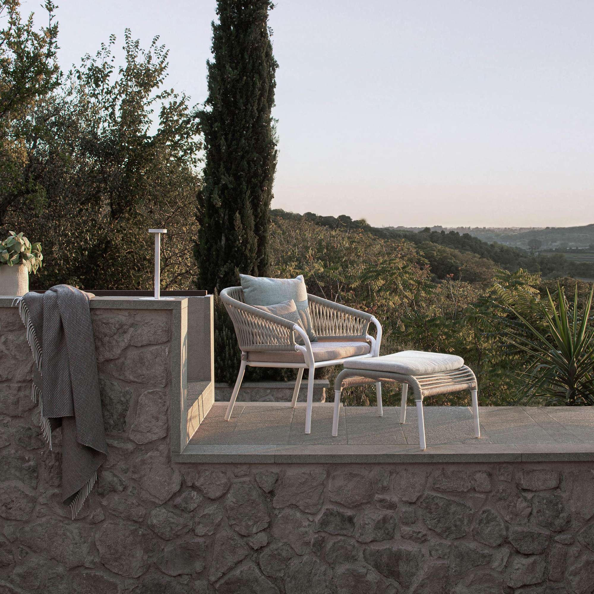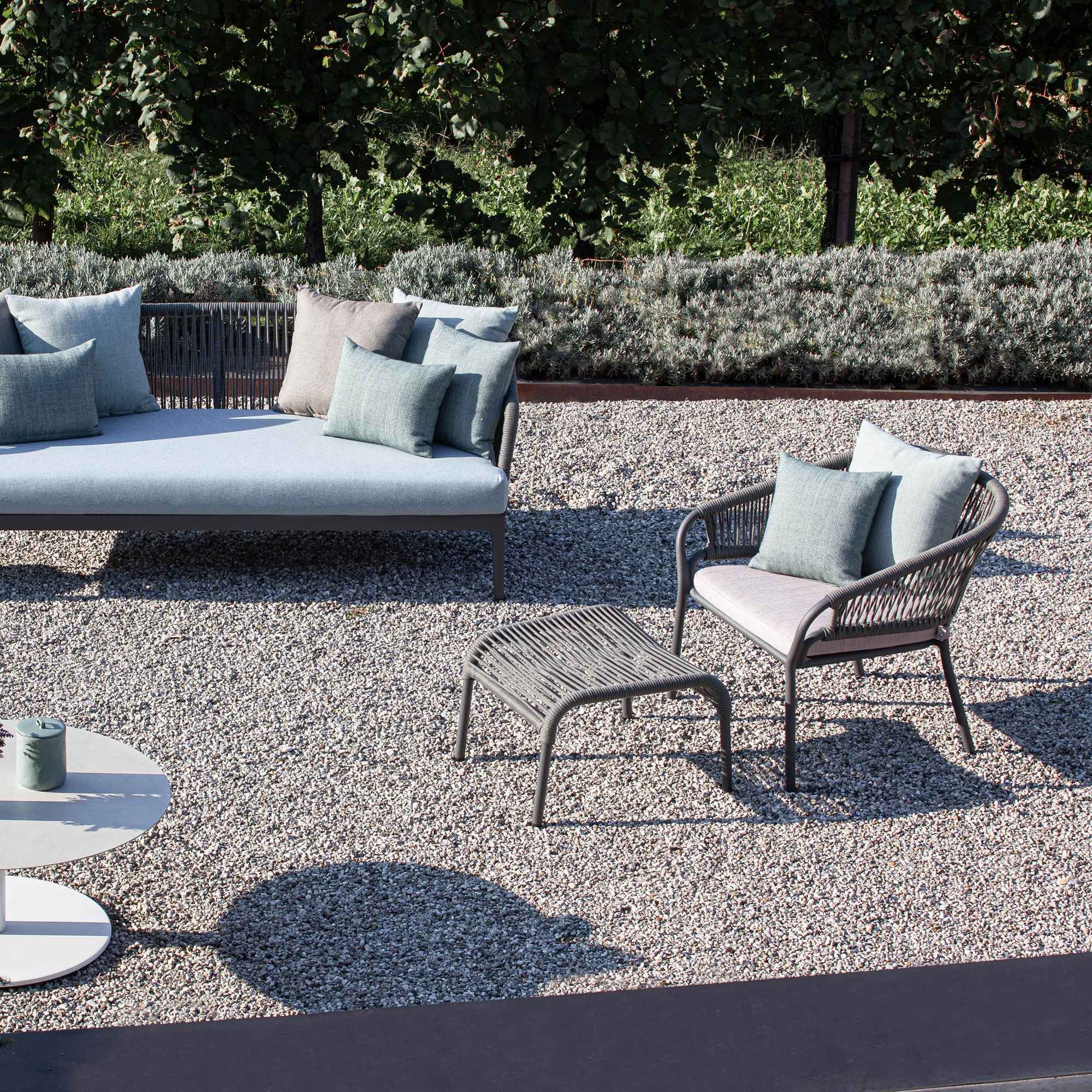 The Pleasure 2.0 outdoor lounge chair is crafted with a structure in either white or graphite aluminum, enveloped in an interwoven texture of ropes that mimic textile fibers, and features a seat cushion covered in outdoor fabric. Compact and stylish, the Pleasure 2.0 outdoor lounge chair achieves the perfect balance between refined design and comfort. Its sturdy structure and high-quality materials ensure durability and weather resistance, making it an ideal choice for furnishing your garden or terrace. Perfect for those who seek to blend elegance with functionality, the Pleasure 2.0 chair invites moments of true relaxation under the open sky. Suitable for intimate gatherings or enjoying a drink at sunset, this chair adds a touch of class and warmth to outdoor living. With Pleasure 2.0, every exterior setting is enriched with style and comfort, reflecting a contemporary aesthetic that does not overlook the importance of well-being. Detailed in its form and elements, the chair is designed to provide an ergonomic and enveloping seat. It also combines easy maintenance with the beauty of an outdoor furnishing designed to last over time. Designed by Atmosphera Creative Lab.