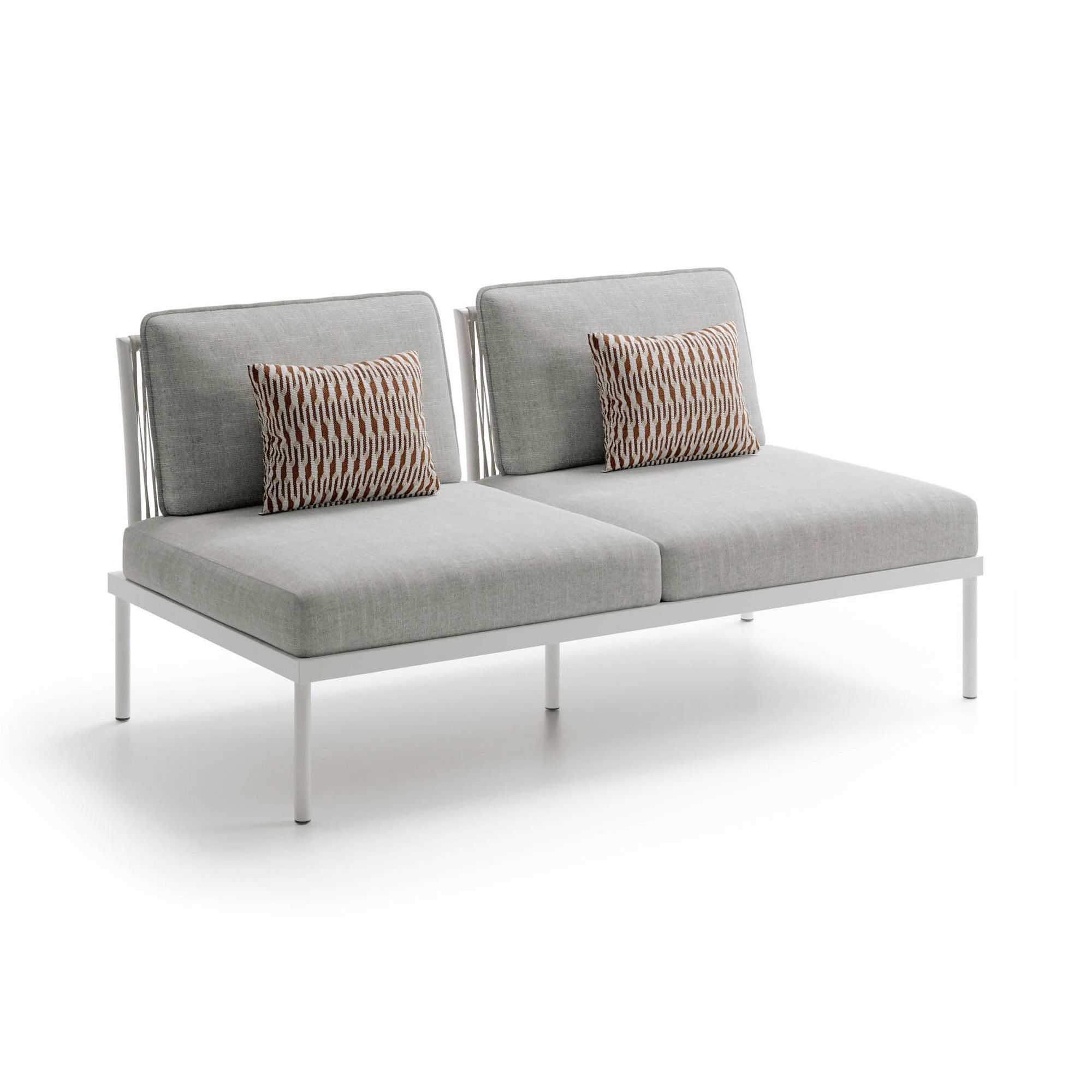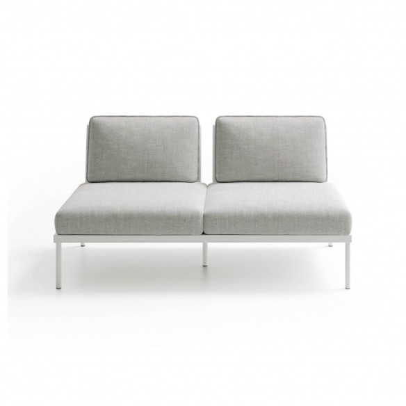 The Flash central double seat module is crafted with an outdoor-grade epoxy-coated aluminum structure and seat and back cushions covered in outdoor fabric. Available in a wide range of color combinations, the Flash central double seat module is ideal for those seeking a sophisticated and modular outdoor furnishing solution. Highly customizable, the module seamlessly integrates with other elements of the Flash collection, allowing for personalized configurations according to specific space and style needs. The cushion fabric, specially designed for outdoor use, is water-repellent and easy to maintain, ensuring longevity and ease of care. Perfect for expanding the outdoor seating area, from home gardens to commercial spaces, the Flash central double seat module ensures a welcoming and refined environment. Its ability to withstand UV rays and quick-drying feature make it an ideal choice for outdoor settings, promising to transform every relaxation moment into a unique comfort and beauty experience. Choosing the Flash central double seat module means opting for a functional, durable, and attractive design piece, created to enrich any outdoor space. Designed by Atmosphera Creative Lab.