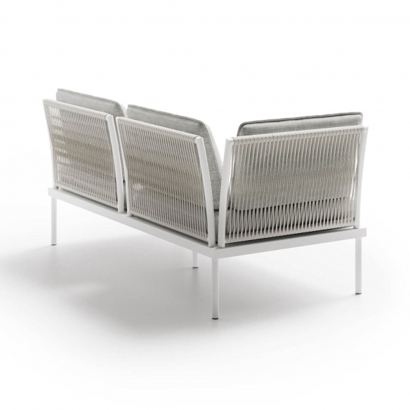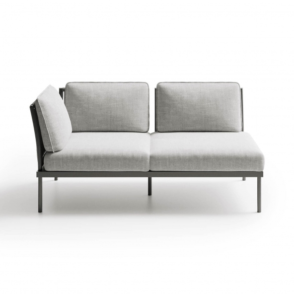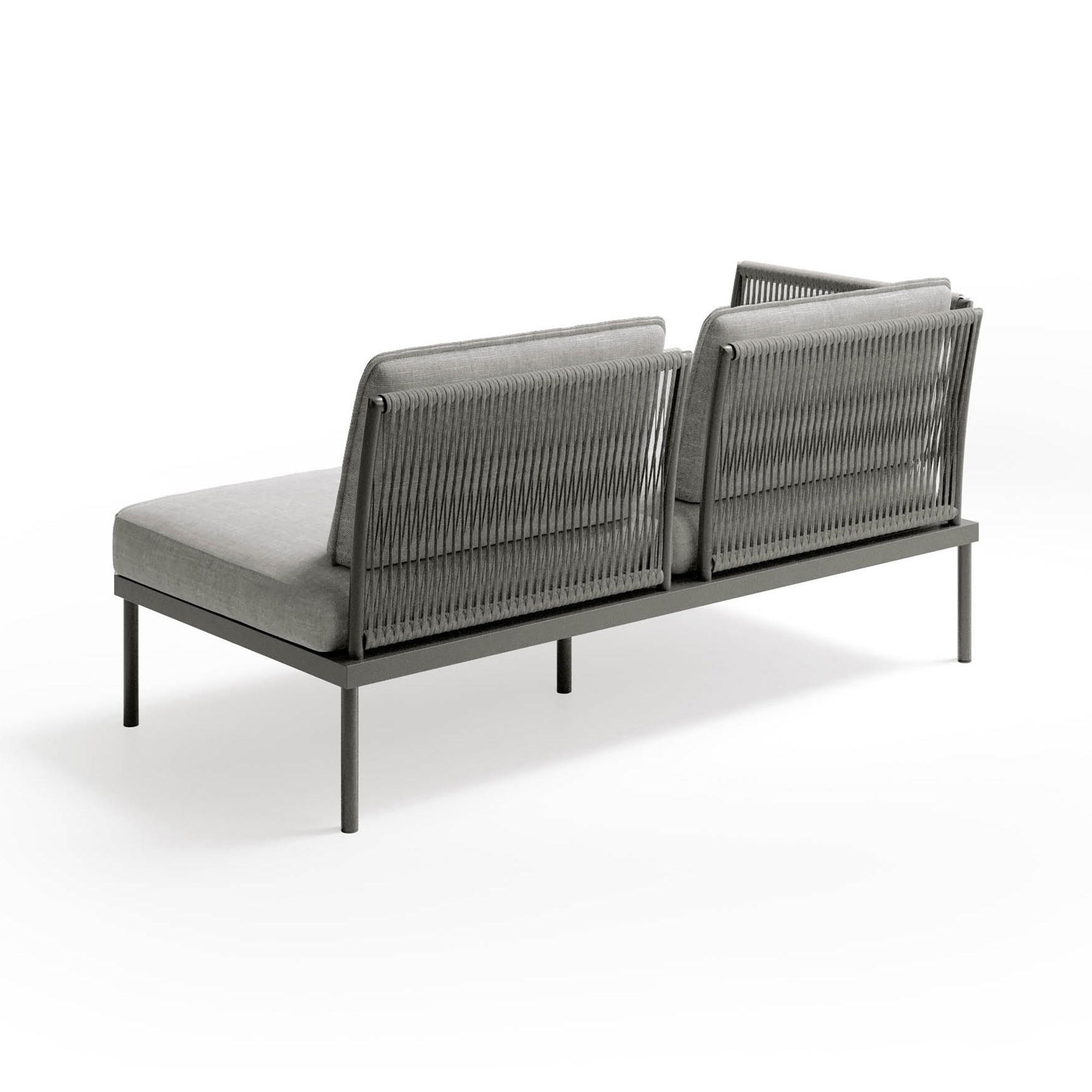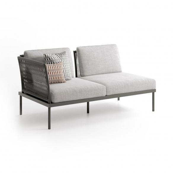 The Flash left corner module, crafted with an epoxy powder-coated aluminum structure for outdoor use, features a hand-woven rope side panel and cushions for the seat and back upholstered in outdoor fabric. Available in various color and fabric combinations, the Flash corner module is an elegant piece of furniture that combines functionality and sophisticated style to personalize your outdoor environment. Designed to seamlessly integrate into any space, this piece is perfect for creating outdoor lounge corners where comfort meets contemporary design. Constructed with a sturdy epoxy powder-coated aluminum frame, it ensures durability and resistance to weather elements. The outdoor fabric cushion covers, available in various color options, are specially treated to resist moisture and UV rays, maintaining their beauty and integrity over time. This left corner module is ideal for those looking to optimize space by creating cozy conversation areas or for those wanting to add extra seating in a garden, terrace, or patio. Its clean design and modern lines make the Flash corner module a true design object, capable of transforming a simple open space into an oasis of relaxation and outdoor elegance.Designed by Atmosphera Creative Lab.