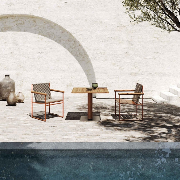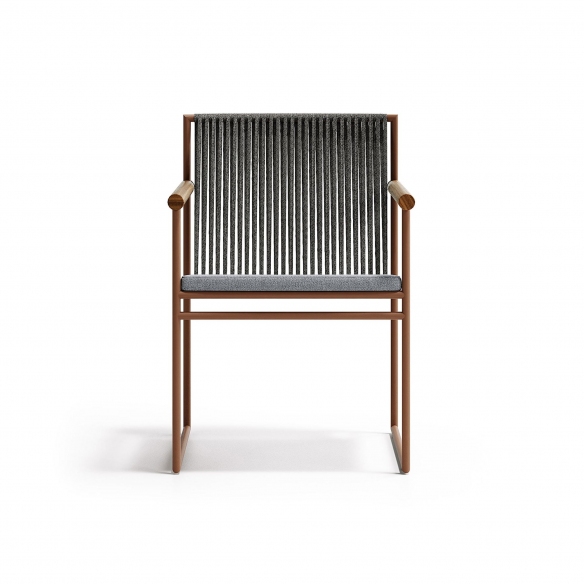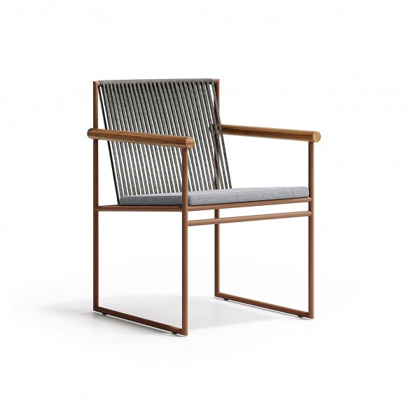 The Pipe outdoor armchair, crafted with a terracotta-colored painted steel frame, teak armrests, handwoven rope backrest and seat cushion covered in outdoor fabric, is available in various fabrics and colors. This outdoor armchair combines durability and style, making it ideal for terraces, gardens, and pool areas. The premium teak wood armrests provide not only comfortable support but also enrich the design with a touch of natural warmth, maintaining aesthetic consistency across the entire Pipe collection. The addition of the handwoven rope backrest underscores the attention to detail and craftsmanship, contributing to an inviting and relaxing atmosphere. Designed to withstand the elements over time, ensuring a lasting investment, this armchair can be placed individually as a focal point or grouped to welcome family and friends. Ideal for those seeking an option that combines functionality with a refined aesthetic, the Pipe outdoor armchair is an excellent choice for enhancing any outdoor setting with style. Designed by Busetti Garuti Redaelli for Atmosphera.