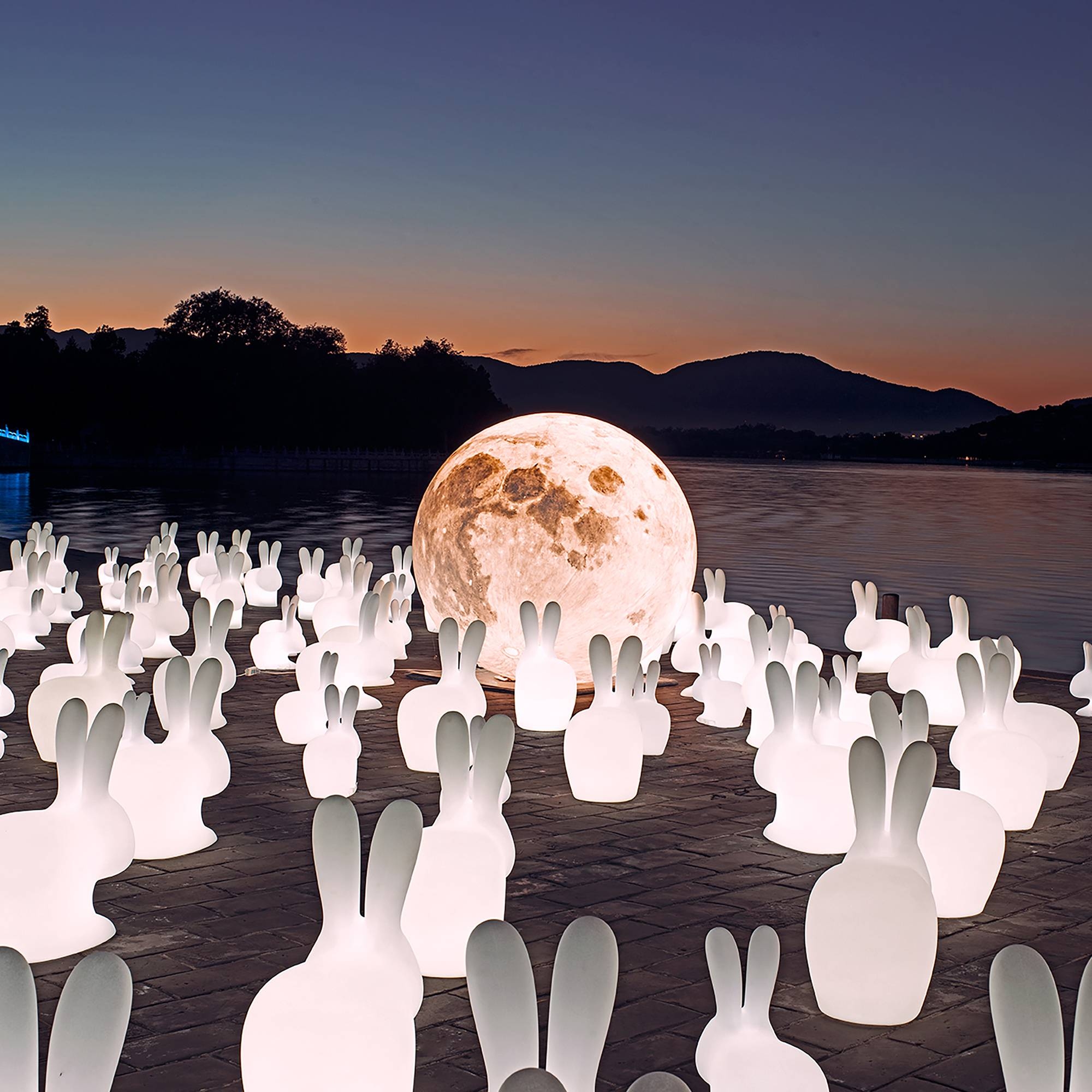 The Rabbit lamp, featuring integrated LEDs, is crafted by Qeeboo using recyclable polyethylene, a high-quality material that ensures durability, resistance, and versatility, making it ideal for outdoor use. This delightful outdoor lamp, thanks to its unparalleled and playful design, fits perfectly into any space, even with different decorative styles, from a modern garden with a pool to a minimalist design terrace. Moreover, the Rabbit lamp represents a very sweet rabbit sitting upright, with long ears that not only contribute to its expressiveness but also serve as a practical support, allowing the lamp to be easily moved according to the users' needs. The lamp is not just a lighting product, but a real piece of design that acts as a focal point in any outdoor configuration and captures the attention of your guests. Designed by Stefano Giovannoni for Qeeboo.