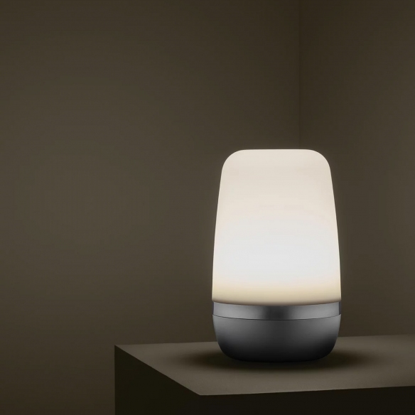 Spirit outdoor table lamp, small version, made of matt stainless steel and plastic. Equipped with a moving LED light source, this lamp is easy to recharge via USB cable. With two adjustable brightness levels, you can create the ideal lighting for any situation. The satin plastic lampshade spreads a soft, shimmering light, complemented by the elegant matte stainless steel ring and gray plastic base. Battery life ranges from 6 to 12 hours, ensuring long evenings of cozy light. The Spirit table lamp is available in 3 color finishes and in a larger size, and is also splash-proof.