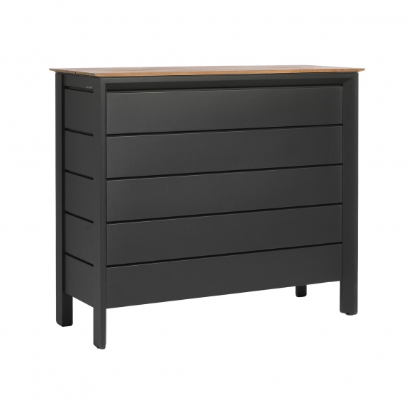 The Metris teak top bar cabinet is made entirely of high quality painted aluminium, ensuring durability and maintaining its beauty over time. The focal point of this Metris bar cabinet is its Teak top, a wood known for its excellent properties of resistance to humidity, UV rays and mold formation, making it ideal for outdoor use. The Metris teak bar cabinet by Diphano is available in two beautiful colours, white and lava, and represents a synthesis between functionality and refined style, perfect for enriching outdoor spaces such as gardens, terraces, poolside, etc. The clean lines and elegant design make it adaptable to different styles of context, from classic to more modern. Metris bar has enough space to place bottles, glasses and other bar accessories inside and offers a practical surface for creating cocktails, thus becoming the undisputed protagonist of evenings with friends. With this bar cabinet with Metris teak top, Diphano has created not just a piece of furniture, but a real piece of design that combines refined aesthetics and high-level performance.