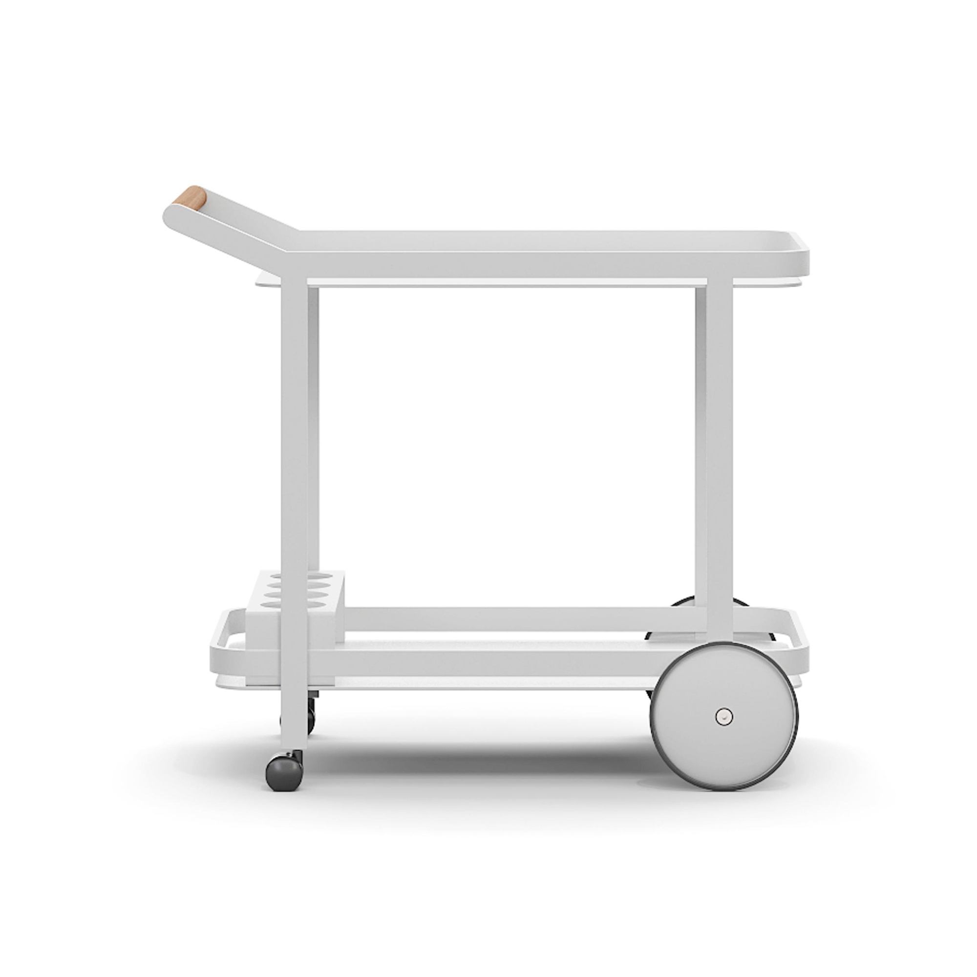 Butler outdoor trolley made of galvanized iron and painted with epoxy powders for outdoors and details in solid Asian teak. Available in 3 stunning colours, the Butler outdoor trolley is an essential piece of furniture for any outdoor space, combining durability and sophisticated design. Made with galvanized iron structures, painted with epoxy powders specific for outdoor use, the Butler trolley guarantees durability and resistance to atmospheric agents. The refined details in solid Asian teak not only add a touch of natural elegance, but also improve the durability of the trolley, making it perfect for outdoor use. Ideal for serving drinks, carrying dishes or as extra support during your outdoor events, the Butler trolley is the optimal solution for hosting and entertaining with style and practicality. Thanks to its modern design and the quality of the materials, it integrates perfectly into any outdoor environment, from the terrace to the garden, becoming a showpiece that combines functionality and advanced aesthetics. It is not just a trolley, but a true ally in creating special moments in the open air, making every occasion a unique experience. Designed by Atmosphera Creative Lab.