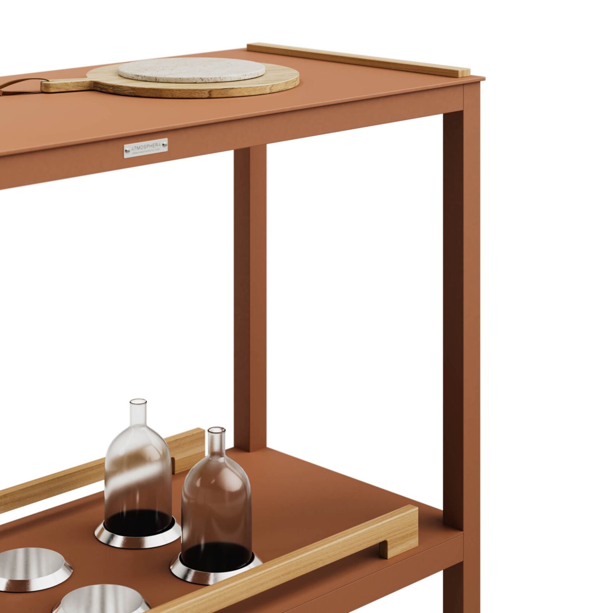 The Flair outdoor console, crafted with a galvanized iron structure and coated with epoxy powders for outdoor use, features details in solid Asian teak and an HPL top. Available in 3 colors, the Flair outdoor console combines elegant design and advanced functionality, making it an excellent addition to any outdoor space. Made with the highest quality materials, this console promises resistance and durability against weathering. The solid Asian teak details offer a natural and sophisticated touch, giving the console a warm and welcoming appearance. The HPL top is particularly suitable for outdoor use, thanks to its weather resistance and ease of maintenance. Equipped with 4 wheels, including 2 that swivel 360°, the Flair console is easily movable, allowing for flexible rearrangement of your outdoor spaces as needed. Whether used as a plant stand, a beverage station during a party, or simply as an attractive focal point in your garden or patio, the Flair console is designed to enhance both the functionality and the aesthetics of your outdoor space. Designed by Atmosphera Creative Lab.