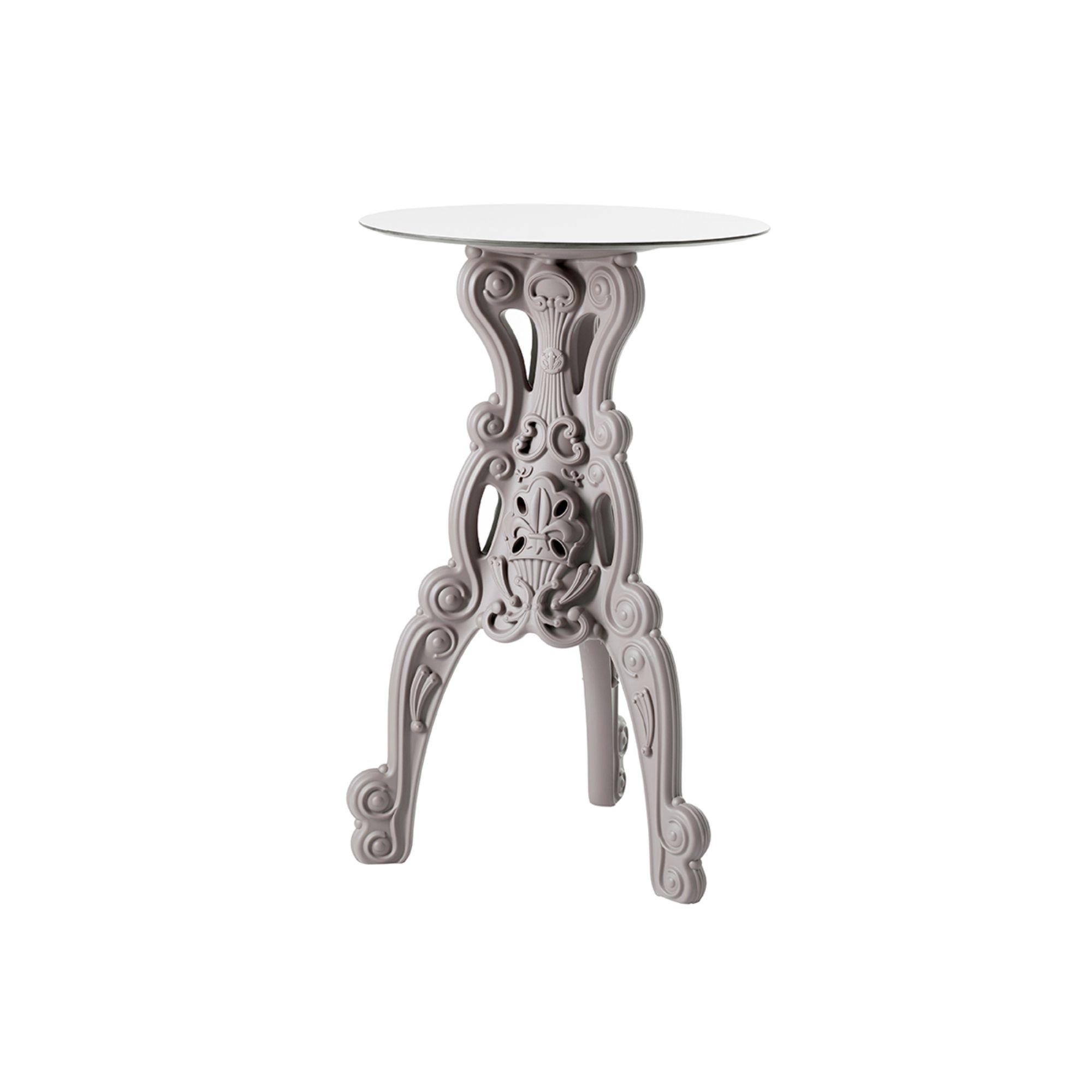 The Master of Love table with a round top, 69 cm in diameter, is a beautiful piece of furniture made by Slide from polyethylene and an HPL top, ideal for both indoor and outdoor spaces. This tall table features a luxurious design brimming with details, and its baroque-style curved legs blend perfectly into classic, modern, or minimalist settings. Whether placed in a garden, a living room, or on a terrace, Master of Love stands out as a unique furnishing item that never goes unnoticed. Moreover, the table is available in various combinations, suitable for events and contract spaces. Its round top, measuring 69 cm in diameter, provides space to accommodate 3 to 4 people, making it perfect for gatherings with friends or family. The Master of Love table was designed with sustainability in mind, made from fully recyclable materials. This aspect, combined with attention to detail and construction quality, makes Master of Love by Slide the perfect option for those looking for a durable, aesthetically pleasing, and environmentally friendly product. Designed by Moro & Pigatti for Slide.