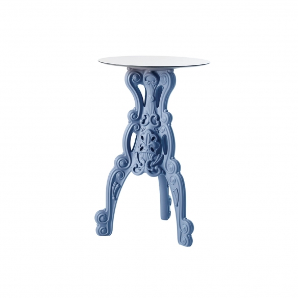 The Master of Love table with a round top, measuring 79 cm in diameter, is a stunning piece of furniture crafted by Slide from polyethylene with an HPL top, perfectly suited for both indoor and outdoor spaces. This tall table boasts a luxurious and intricately detailed design, and with its curved legs that evoke a baroque style, it integrates seamlessly into classic, modern, or minimalist settings. Whether placed in a garden, a lounge, or on a terrace, the Master of Love serves as a distinctive furnishing piece that is sure to catch the eye. Additionally, the table is available in various configurations, making it suitable for events and contract areas. Its round top, with a diameter of 79 cm, provides ample space to seat 4 or more people, making it ideal for socializing with friends or family over drinks. The Master of Love table has been thoughtfully designed with sustainability in mind, constructed from entirely recyclable materials. This consideration, along with meticulous attention to detail and construction quality, makes Slide's Master of Love a perfect choice for those seeking a product that is durable, visually appealing, and environmentally conscious. Designed by Moro & Pigatti for Slide.