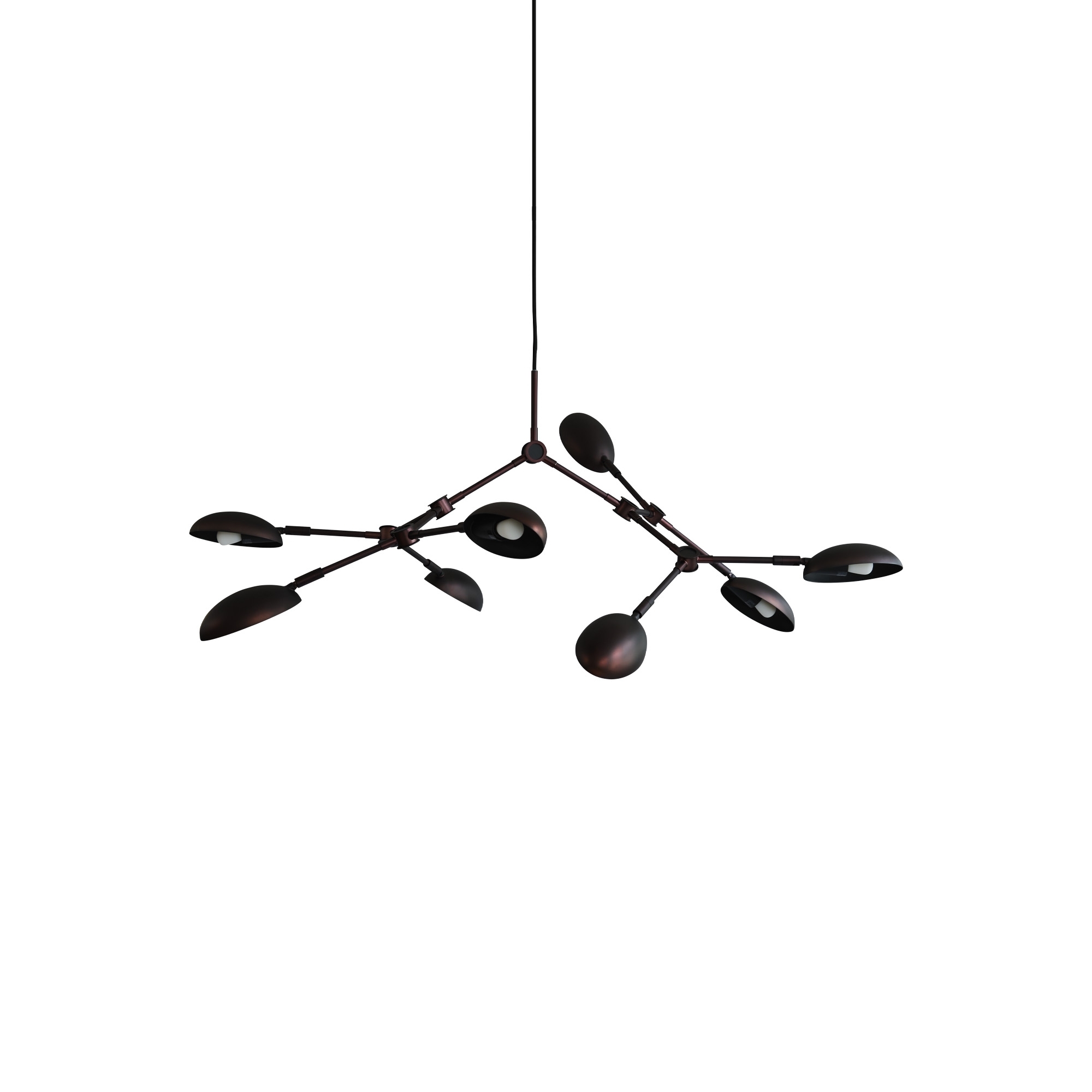 Drop Mini chandelier in oxidized metal, plated and subsequently hand brushed, rosette and diffusers in iron with plated brass finish and adjustable arms. Available in Brass, Bronze, Oxidized and Burned Black, the Drop Mini chandelier is made up of several drop-shaped diffusers that emit direct light and can be oriented as desired to illuminate a dining or living area and add an extra touch to the furniture. Light source 48W - E14 - IP20, not dimmable. Designed by Kristian Sofus Hansen & Tommy Hyldahl for 101 Copenhagen.