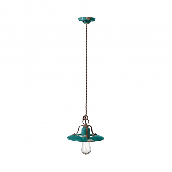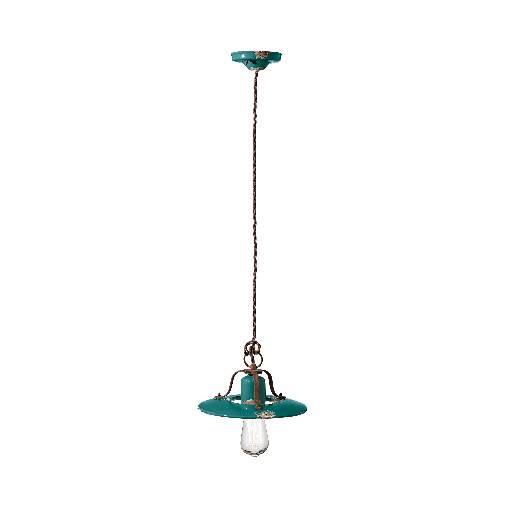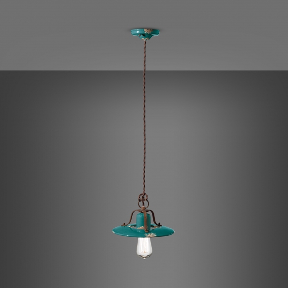 C1441 suspension lamp with diffuser and rosette made of ceramic, details in cor-ten antiqued iron and covered cotton cable. Perfect for illuminating the living room or dining room with a soft and ambient light, the C1441 pendant lamp has a linear and classic design, emphasized by the splendid lacquer coating with details that create a visually worn effect and infuse a vintage touch to a piece of furniture designed to fit into both domestic and contract environments. Combine multiple elements together and choose your color from those available. Light source 1x77W E27 - IP20. Designed and manufactured by Ferroluce.