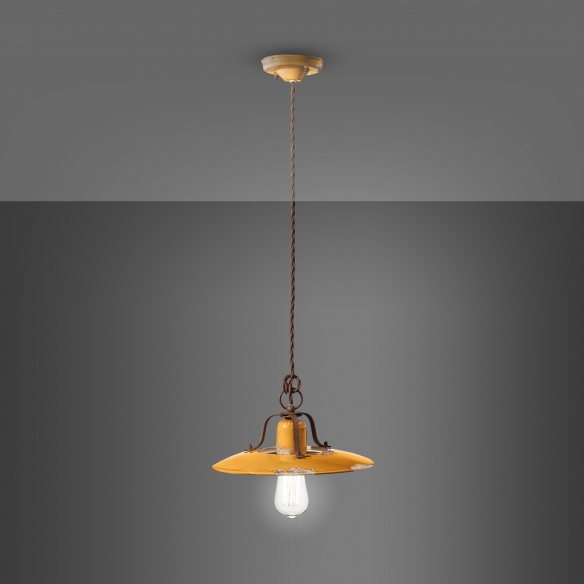 C1442 suspension lamp with diffuser and rosette made of ceramic, details in cor-ten antiqued iron and covered cotton cable. Perfect for illuminating the living room or dining room with a soft and ambient light, the C1442 pendant lamp has a linear and classic design, emphasized by the splendid lacquer coating with details that create a visually worn effect and infuse a vintage touch to a piece of furniture designed to fit into both domestic and contract environments. Combine multiple elements together and choose your color from those available. Light source 1x77W E27 - IP20. Designed and manufactured by Ferroluce.