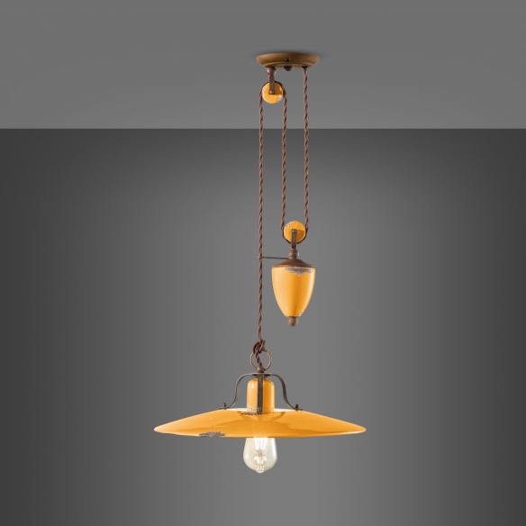 C1446 suspension lamp with rise and fall system, diffuser and rosette made of ceramic, details in cor-ten antiqued iron and covered cotton cable. Perfect for illuminating the living room or dining room with a soft and ambient light, the C1446 pendant lamp has a linear and classic design, emphasized by the stunning lacquer coating with details that create a visually worn effect and infuse a vintage touch to a piece of furniture designed to fit into both domestic and contract environments. Combine multiple elements together and choose your color from those available. Light source 1x77W E27 - IP20. Designed and manufactured by Ferroluce.