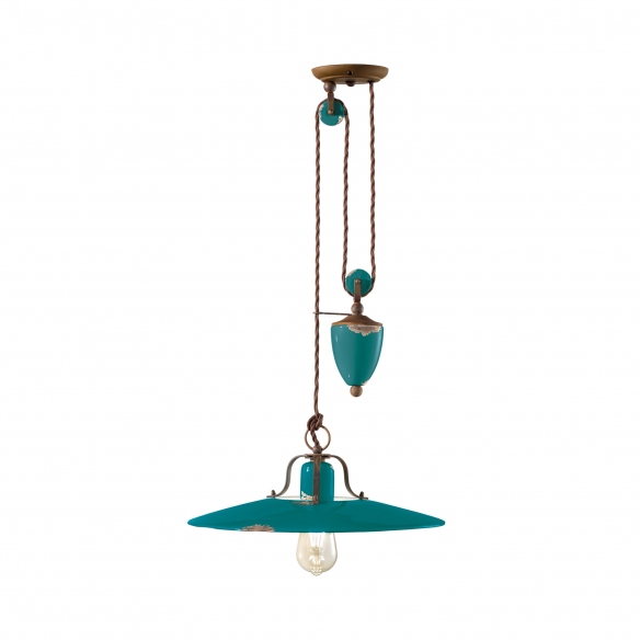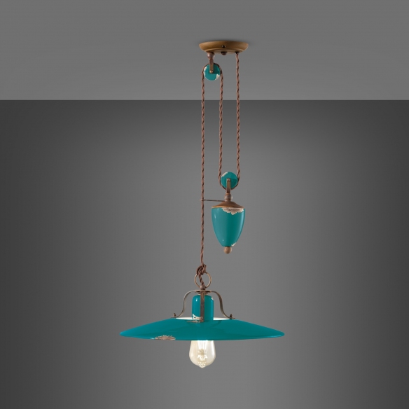 C1446 suspension lamp with rise and fall system, diffuser and rosette made of ceramic, details in cor-ten antiqued iron and covered cotton cable. Perfect for illuminating the living room or dining room with a soft and ambient light, the C1446 pendant lamp has a linear and classic design, emphasized by the stunning lacquer coating with details that create a visually worn effect and infuse a vintage touch to a piece of furniture designed to fit into both domestic and contract environments. Combine multiple elements together and choose your color from those available. Light source 1x77W E27 - IP20. Designed and manufactured by Ferroluce.