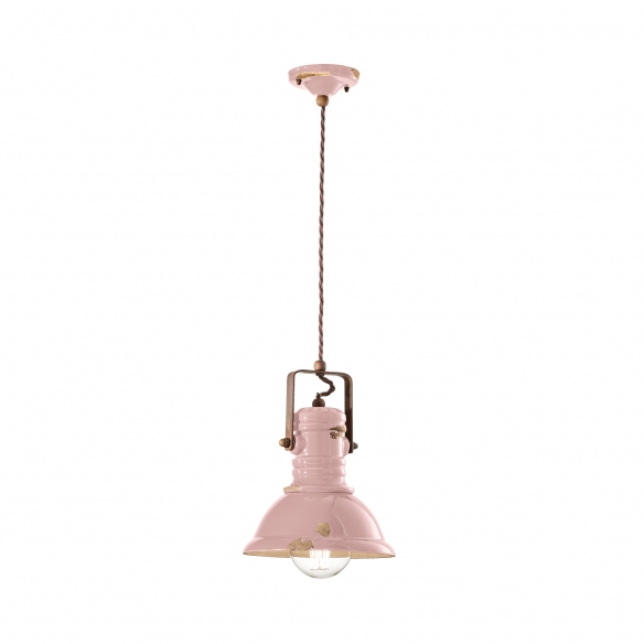 C1691 suspension lamp made of ceramic with cor ten antique iron details, covered cotton cable and rust effect enamelling. Inspired by classic industrial lamps, the C1691 pendant lamp is available in splendid colours, has a half-domed body with soft and pleasant lines and an iron hook that makes it more modern and up-to-date, perfect for illuminating a lounge or dining area of a single light, without ever being dazzling. Light source 1x53W E27 - IP20. Designed and manufactured by Ferroluce.